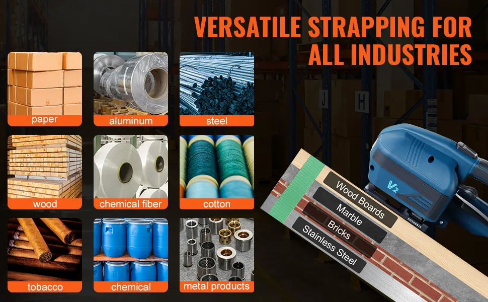 Perfekt für verschiedene Branchen: Ob Sie Papier, Aluminium, Stahl, Holz, Chemiefasern, Baumwolle, Tabak, Chemikalien oder Metallprodukte herstellen, unser Umreifungsgerät hilft Ihnen dabei. Es verarbeitet alles von Holzplatten und Marmor bis hin zu Ziegeln und Stahl und steigert so Ihre Effizienz und Produktqualität auf ganzer Linie.