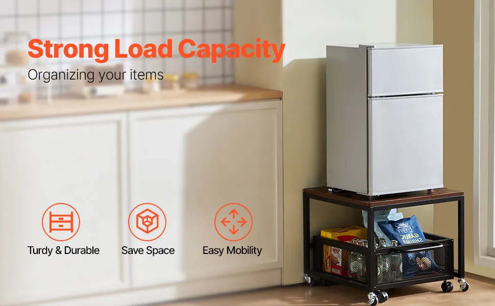 VEVOR Mini-Kühlschrankständer Kühlschrankhalter mit 90 kg Tragkraft, Kühlschranktisch mit beweglichem Lagerwagen & Schwenkrädern, Getränkekühlschrankständer für Kaffeebar Wohnung Dunkelbraun