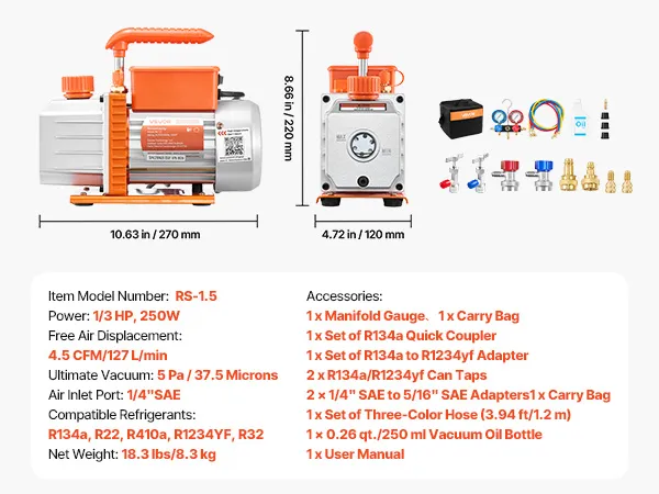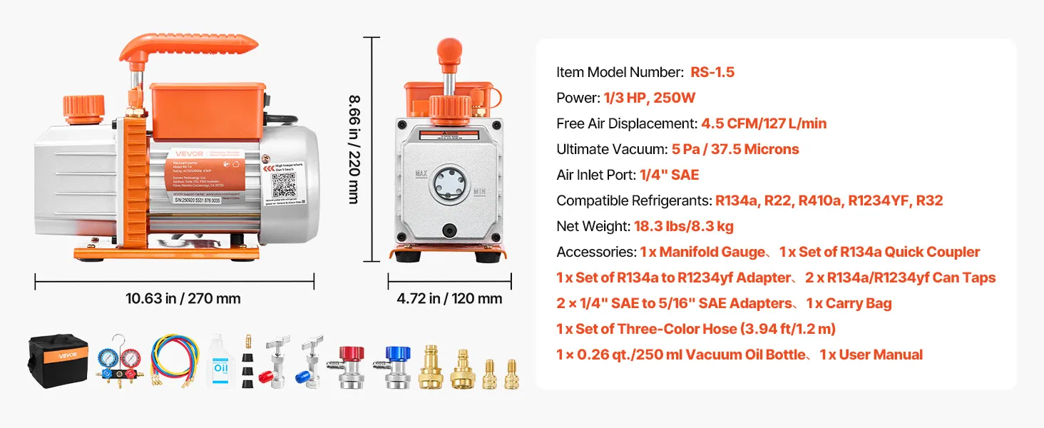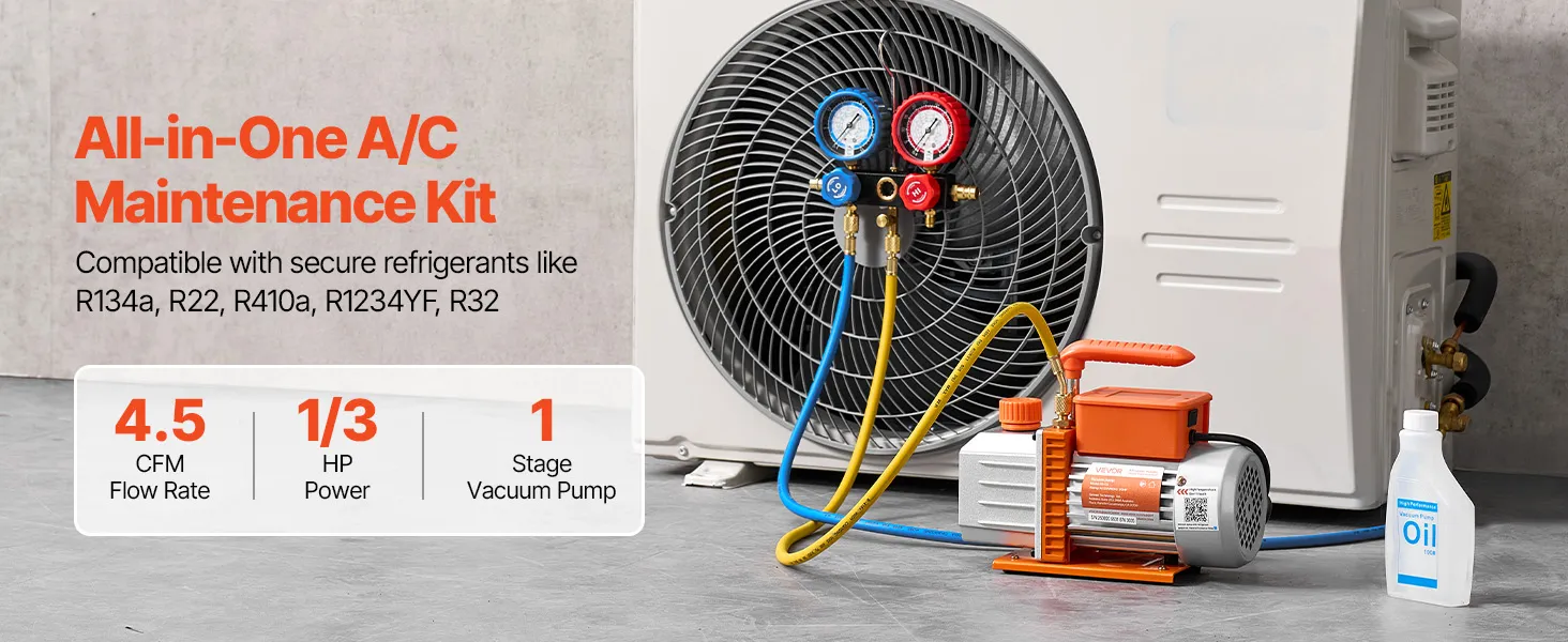 Equipped with a 4.5 CFM vacuum pump, 5 Pa ultimate vacuum, a high-precision manifold gauge, and a three-color hose, this complete set provides efficient support for air conditioning and HVAC maintenance. Durable and precise, it meets the demands of a wide range of refrigeration applications.