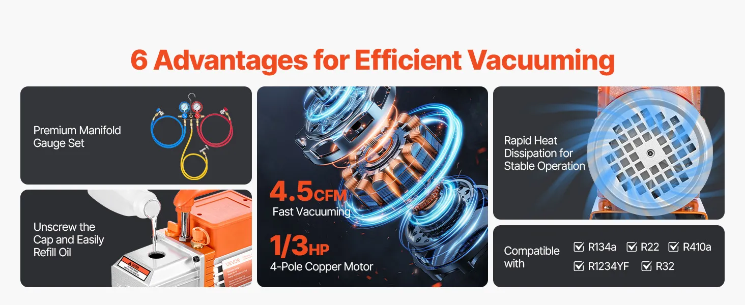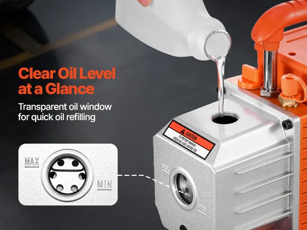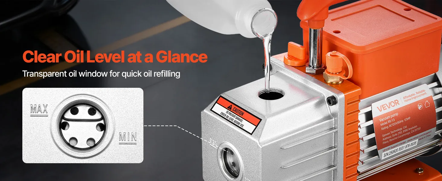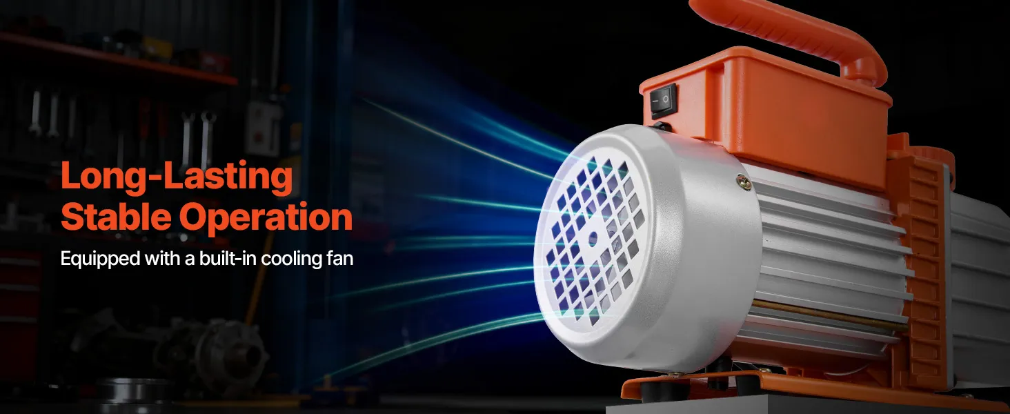 Strong Vacuum Performance: Equipped with a 4-pole high-torque motor, this 4.5 CFM single-stage pump reaches an ultimate vacuum as low as 5 Pa. The built-in 0.26 qt. (250 ml) oil capacity ensures stable, long-term operation with efficient maintenance