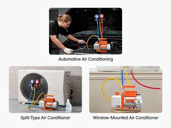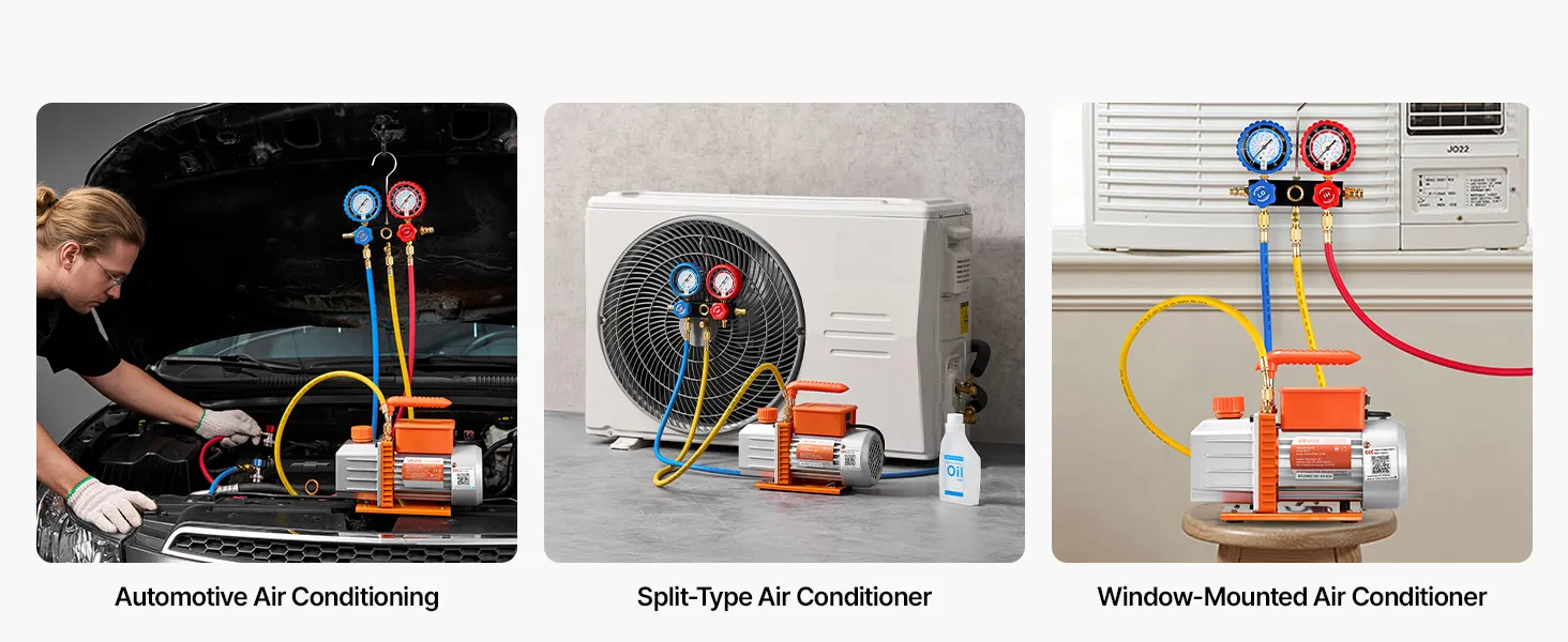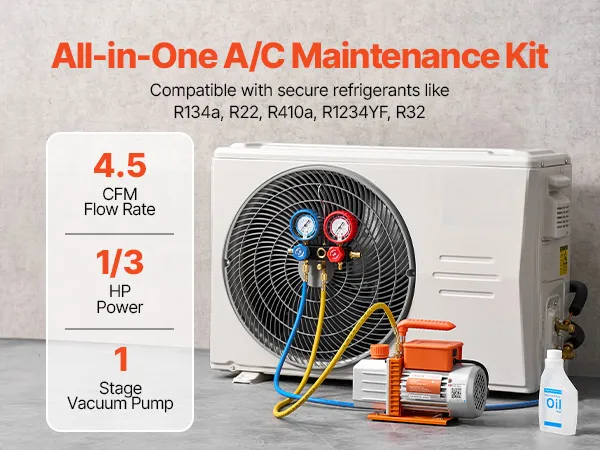 Q: Can this AC vacuum pump kit quickly complete the vacuuming for home air conditioners? Is the flow rate sufficient? A: The pump features a single-stage rotary vane design with a flow rate of 4.5 CFM, making it ideal for home air conditioning systems. It achieves a vacuum level of < 50 Pa, suitable for R134a, R22, R410a, R1234YF, R32, and other non-flammable refrigerants.