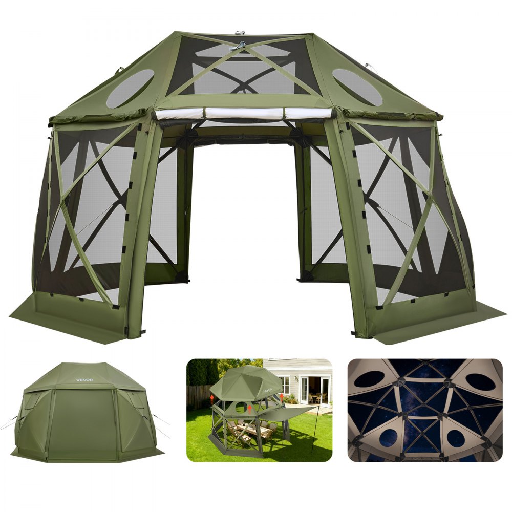 VEVOR Pop up Gazebo Screen Tent, 3.96 x 3.96 m, 13-Sided Spherical Camping Canopy Tent with Removable Top & Carry Bag, Quick-Set & Bite-Proof, Screen House Sun Shelter for 10-12 Persons, Green