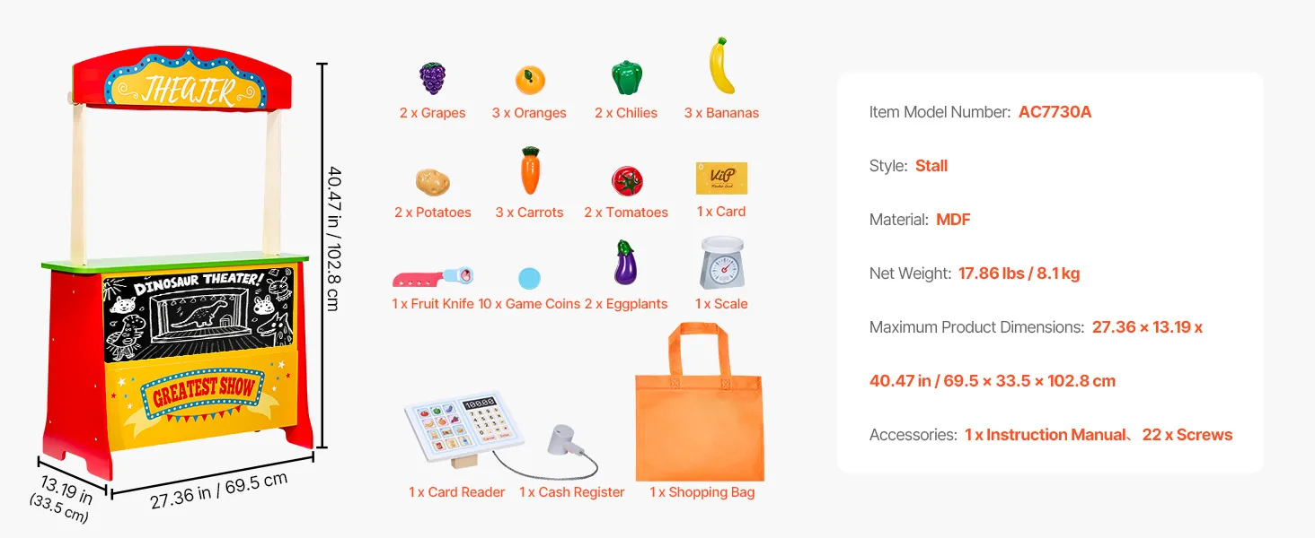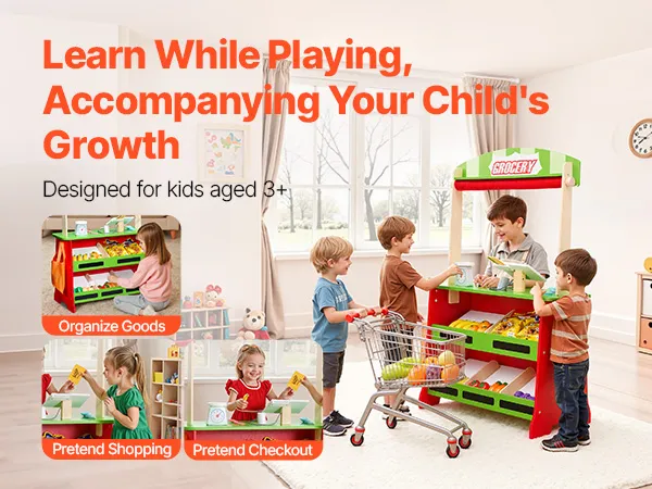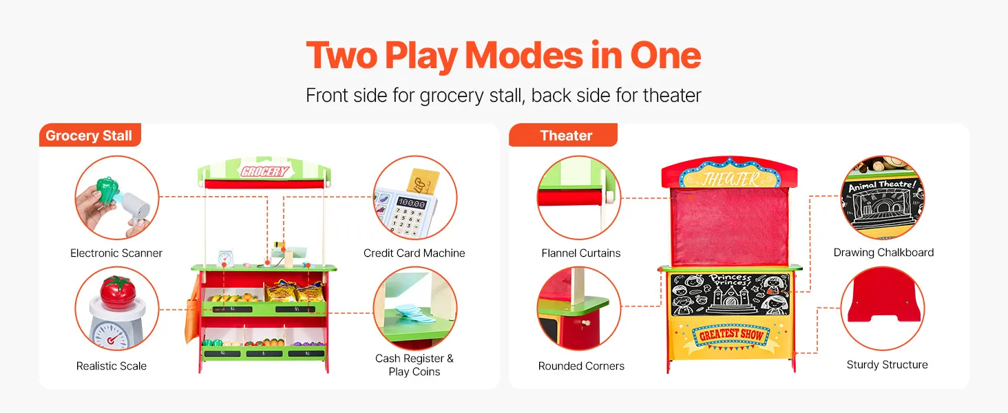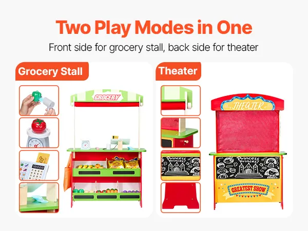 Zwei Szenarien für endlosen Spaß: Dieser Spielzeug-Lebensmittelladen verfügt auf der einen Seite über einen Lebensmittelstand und auf der anderen Seite über ein Mini-Theater, sodass Kinder in verschiedene Rollen schlüpfen können, beispielsweise als Ladenbesitzer, Kunde oder Schauspieler, und so ihre Fantasie und Kreativität anregen können!