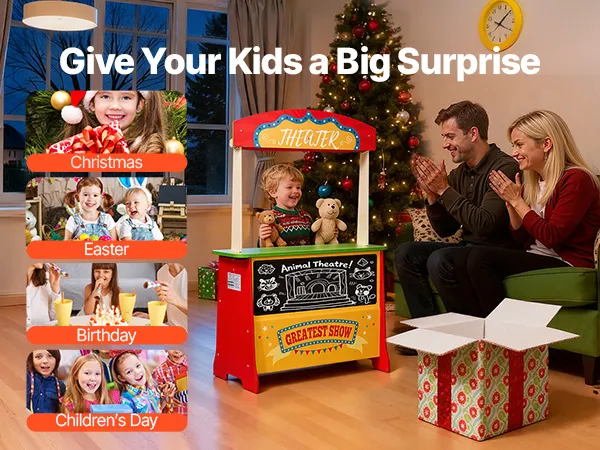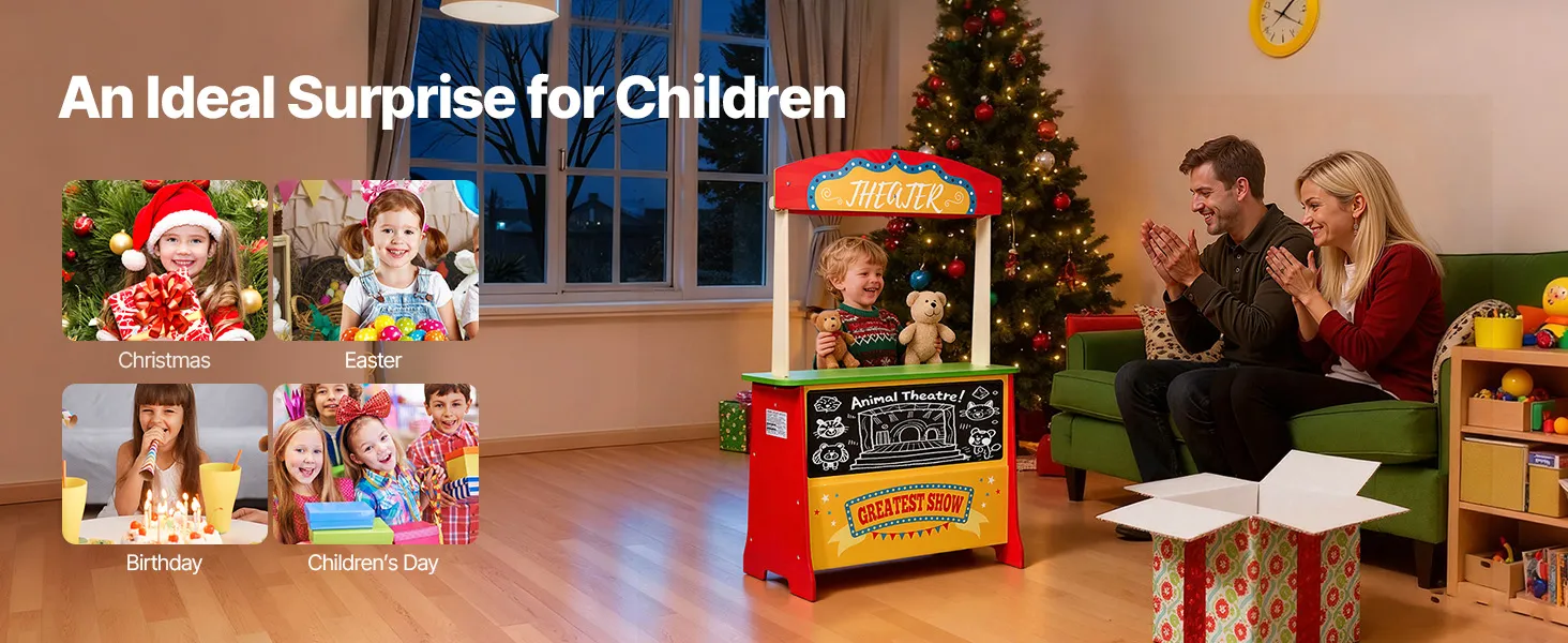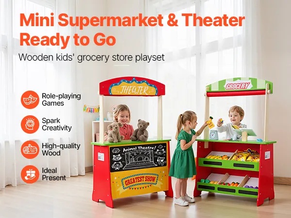 Mit diesem hölzernen Kinderspielset kann Ihr Kind sowohl einen Minimarkt als auch ein kleines Theater genießen! Mit lustigen multifunktionalen Interaktionen, realistischem Zubehör und einer robusten Holzstruktur werden Kinder endlosen Spielspaß haben!
