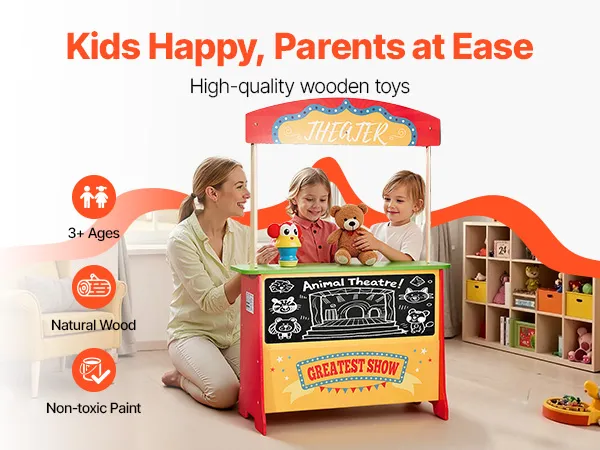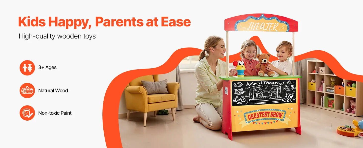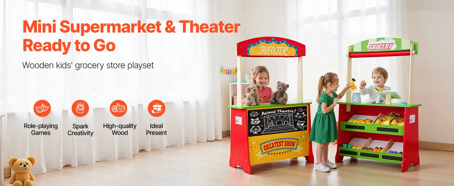 VEVOR 2-in-1 Spielset Puppentheater aus Holz mit Vorhängen, Kaufmannsladen, doppelseitiges Holzspiel mit Tafel und Registrierkasse, Marktstand zum Rollenspiel für Kinder ab 3 Jahren