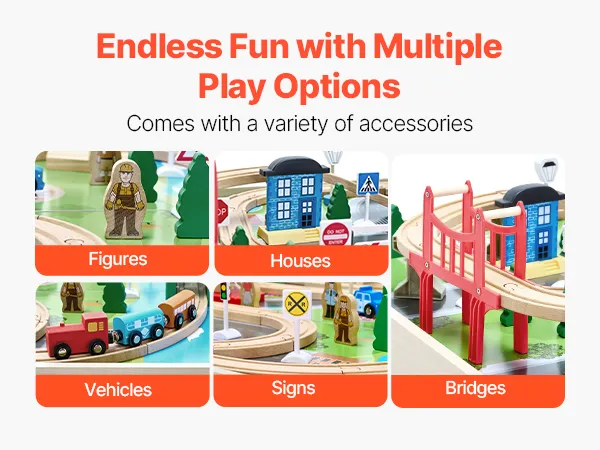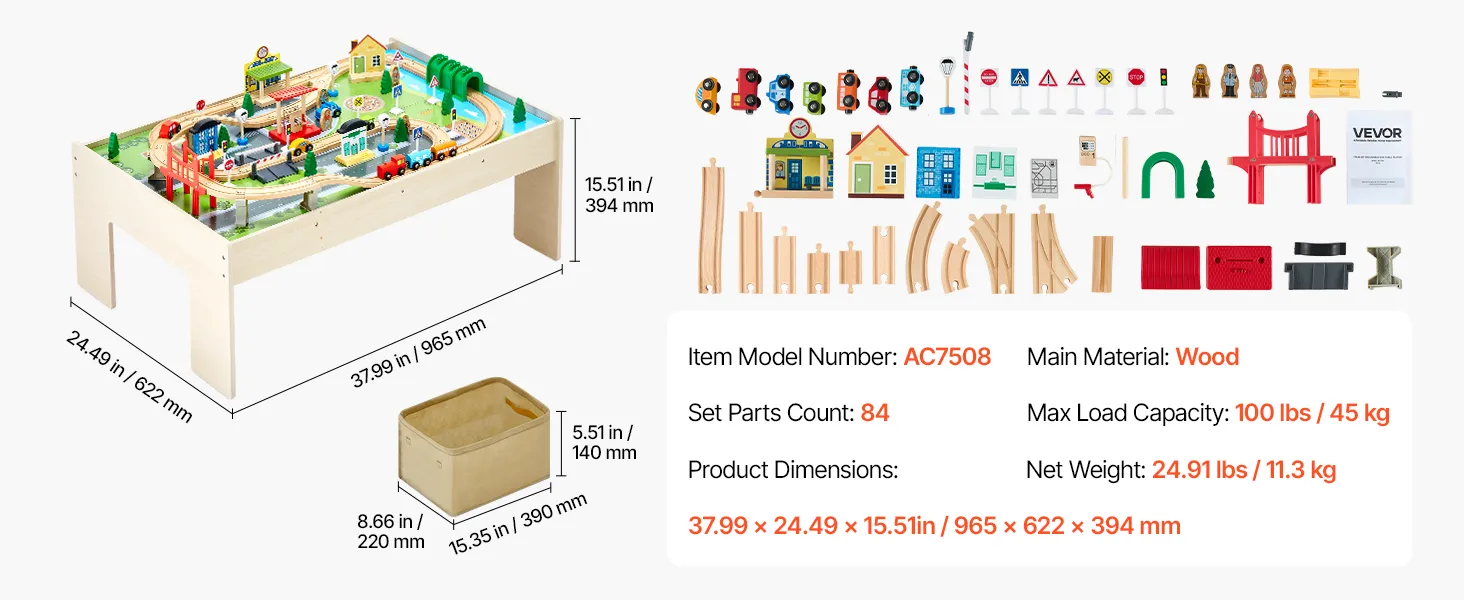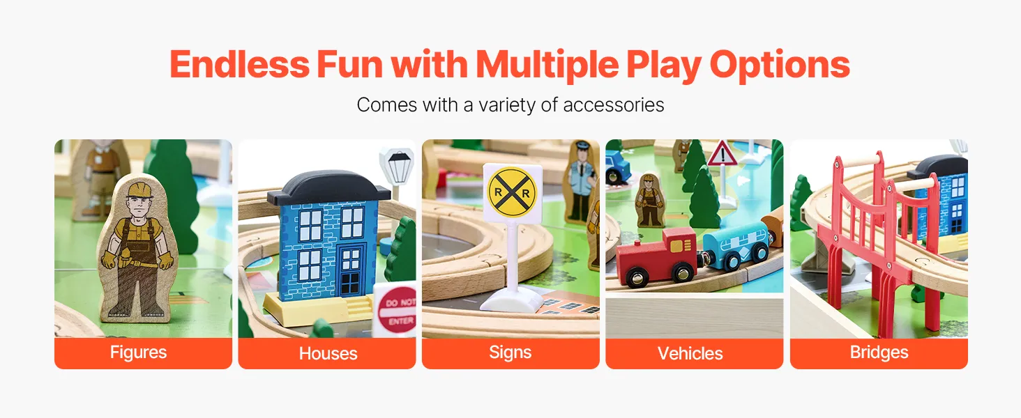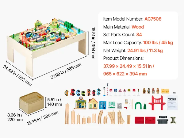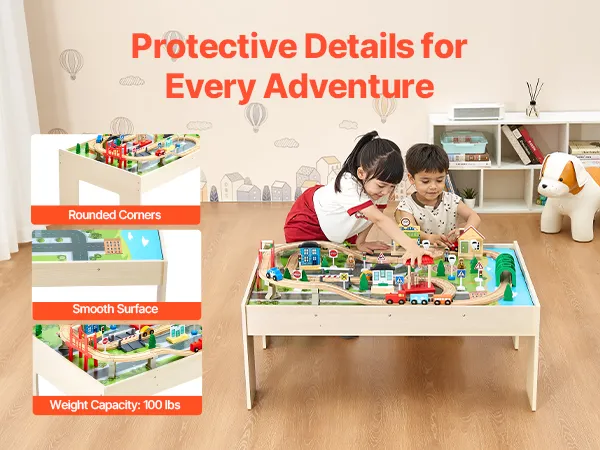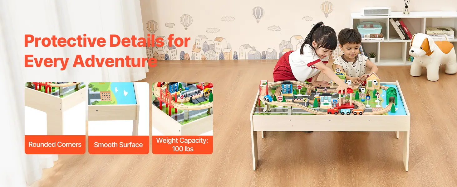 Der Eisenbahntisch verfügt über abgerundete Ecken, um Stöße zu vermeiden, eine glatte, gratfreie Oberfläche, um Kratzer zu vermeiden, und eine Tragfähigkeit von 45 kg. Er ist so konstruiert, dass er dem Spielen der Kinder standhält und den Eltern ein beruhigendes Gefühl gibt.