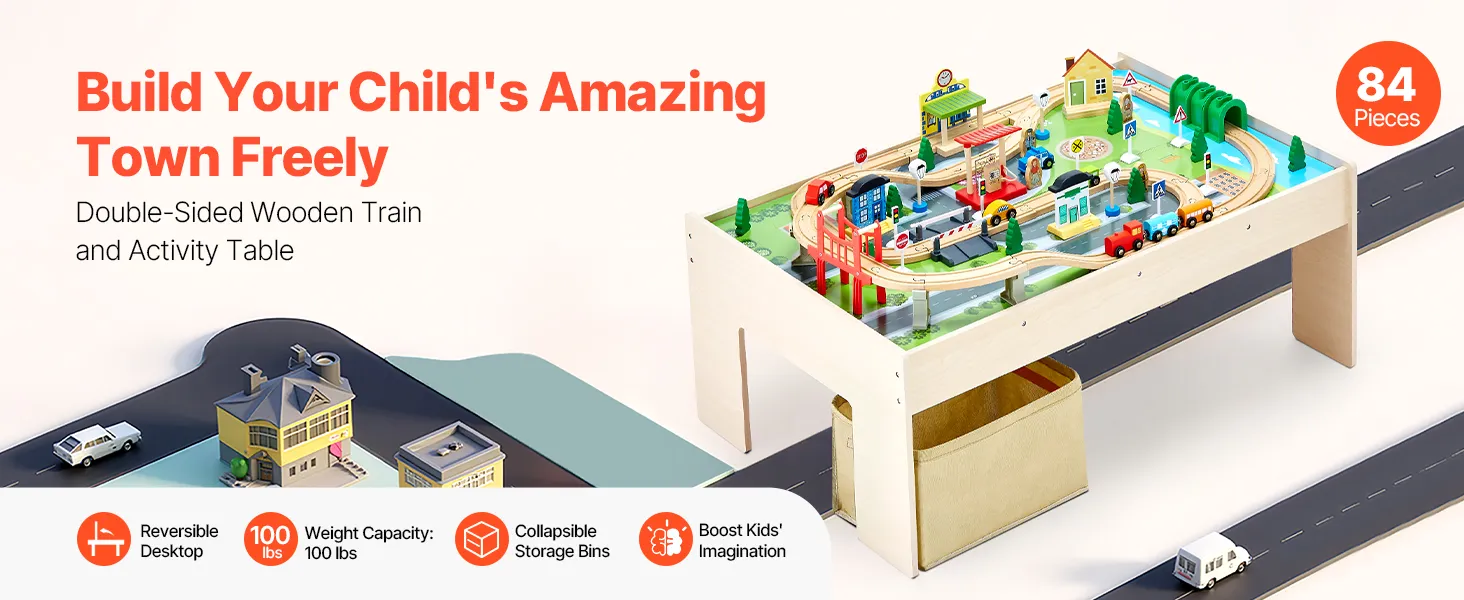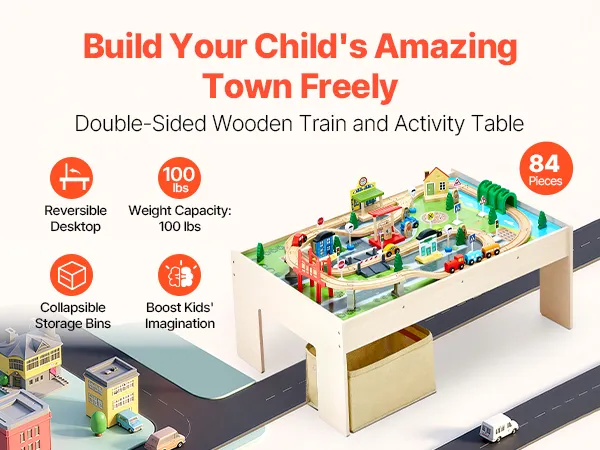 VEVOR Holz Aktivitätstisch, 84-teilig, mit zusammenklappbarem Aufbewahrungsbehälter, 3-in-1-Eisenbahnset zum Spielen, Malen, Lesen, Essen, kreatives Spielzeugset für Kinder ab 3 Jahren