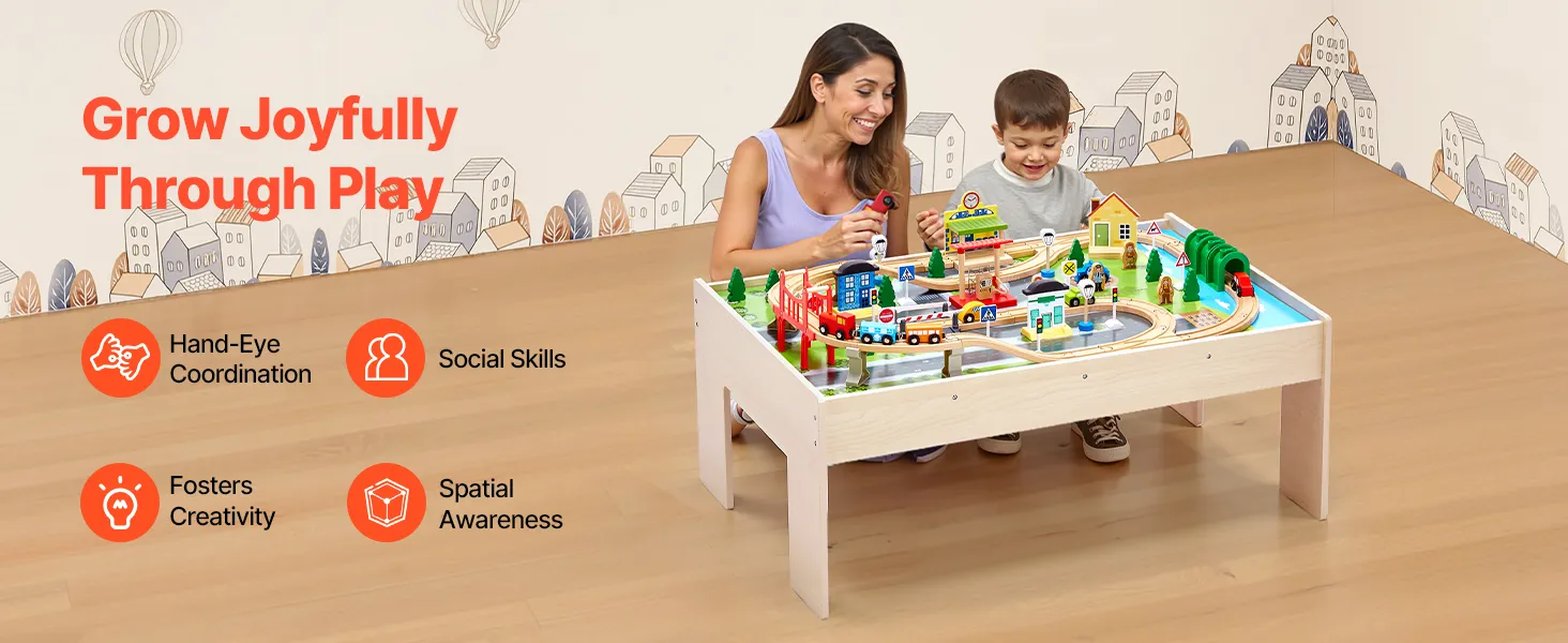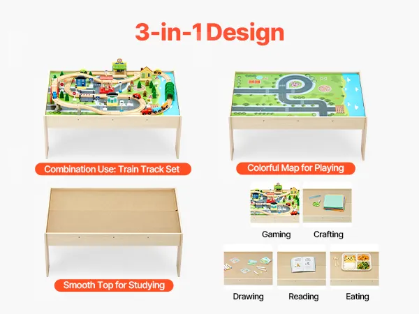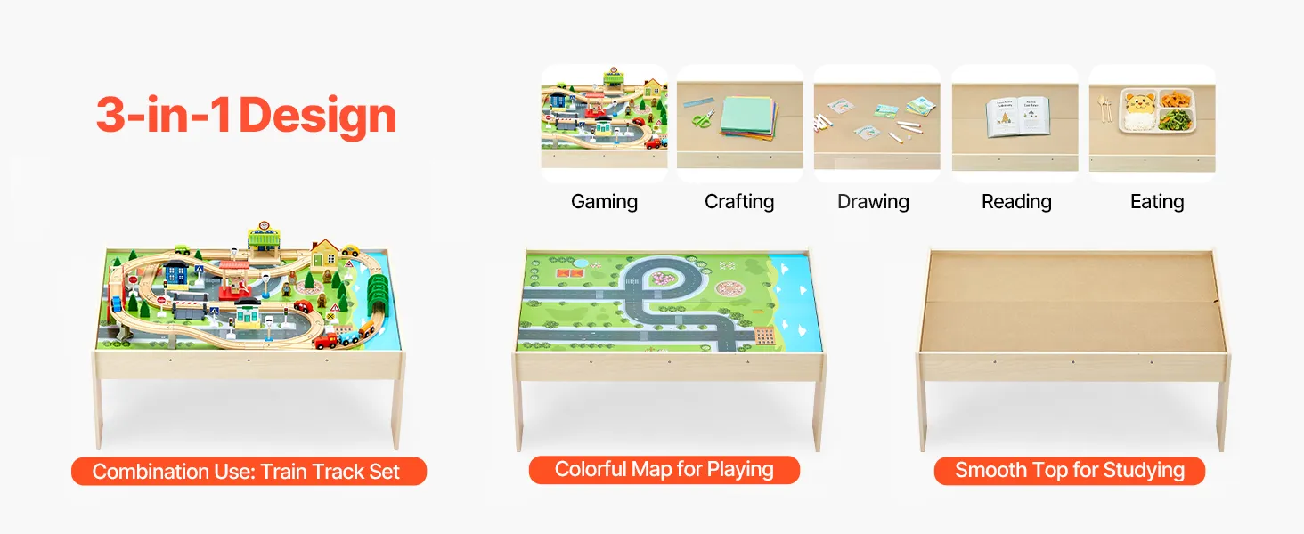 Multifunktionale Tischplatte: Der Kindereisenbahntisch hat eine umkehrbare Oberfläche – eine Seite zum Spielen mit Eisenbahnschienen und die andere zum Lernen, Basteln und Zeichnen, was vielseitige Nutzung und Funktionalität ermöglicht
