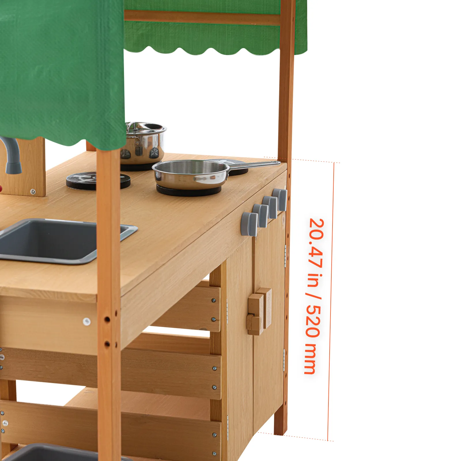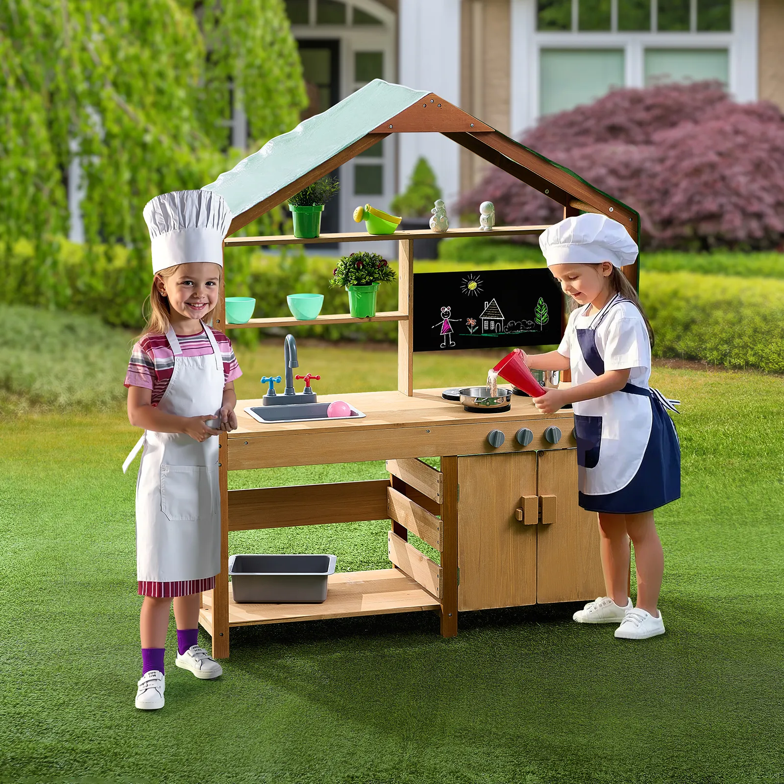 Diese Spielküche für Kleinkinder ist mit Außenfarbe wasser- und korrosionsbeständig behandelt und bietet Kindern einen schattigen Bereich zum Spielen. Sie eignet sich perfekt für den Einsatz in Gärten, Hinterhöfen und auf Rasenflächen.