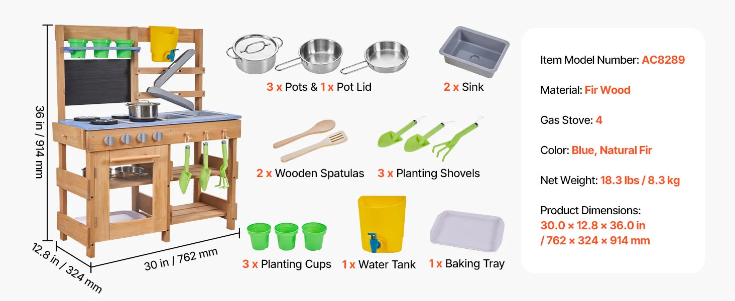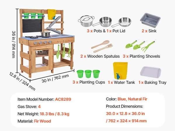 VEVOR Spielküche, Kinderküche, Spielzeugküche mit Herd, Haken, Spülbecken, Pflanzspaten, Pfannenwendern, Griffen, Kochgeschirr & Zubehör, Holzküche für KInder ab 3 Jahren, 762x324x914 mm