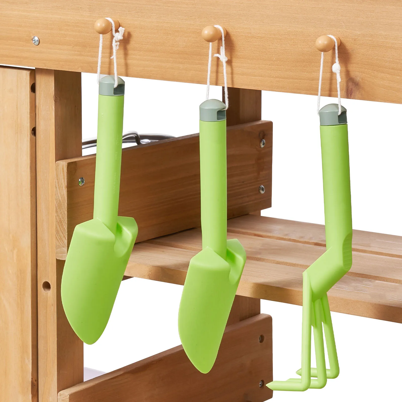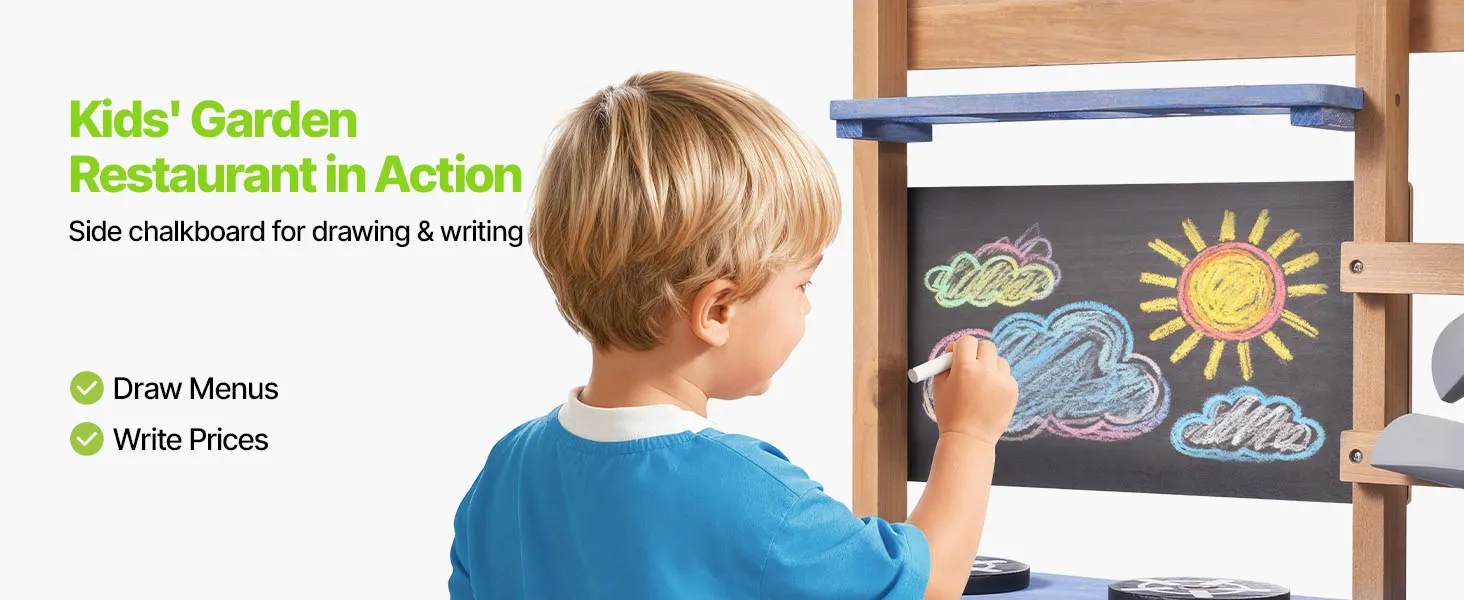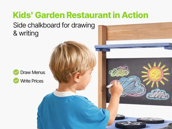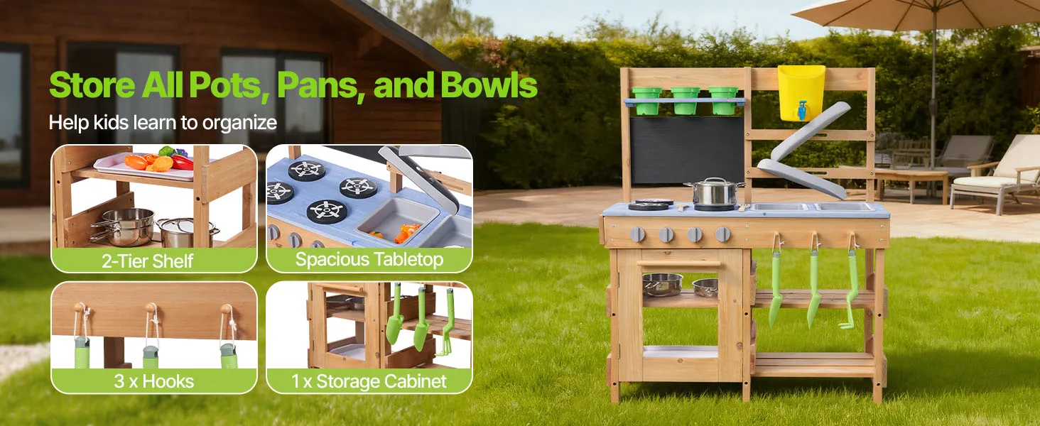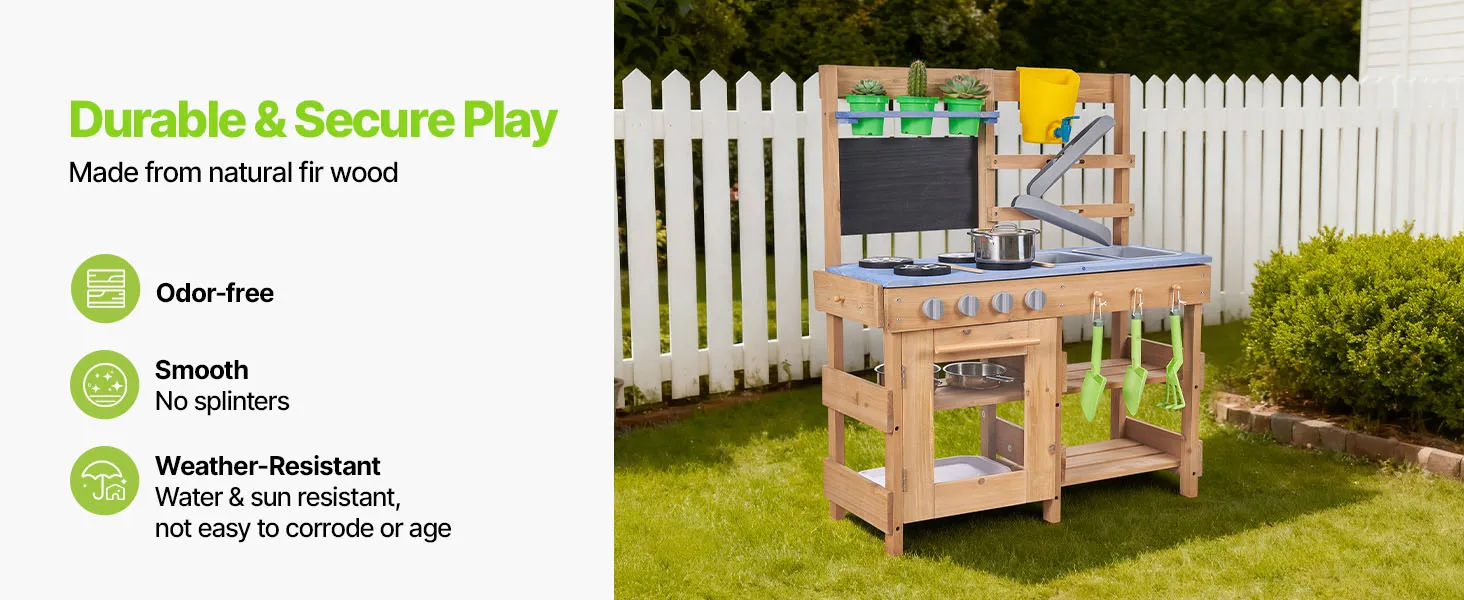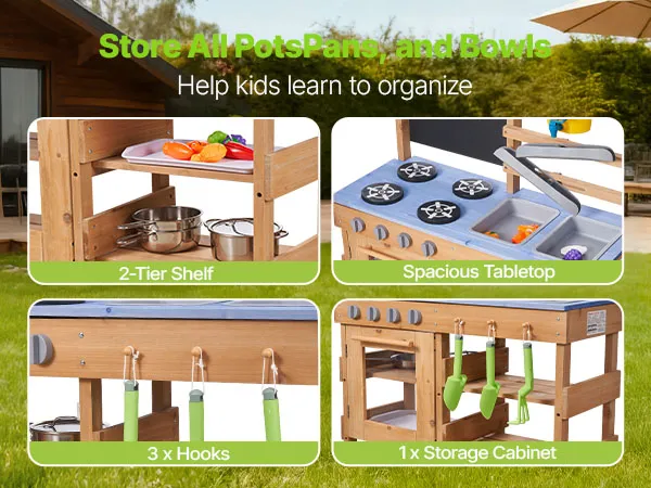 Vielseitige Spielbereiche: Unsere Kinderküche für Kinder im Freien bietet Bereiche zum Kochen, Spielen mit Wasser und Pflanzen. Mit Zubehör wie 3 Töpfen, 2 Holzspateln, 3 Pflanzbechern, 3 Pflanzschaufeln, 1 Backblech und 2 Wasserrohren ermöglicht sie vielfältige Spielmöglichkeiten.