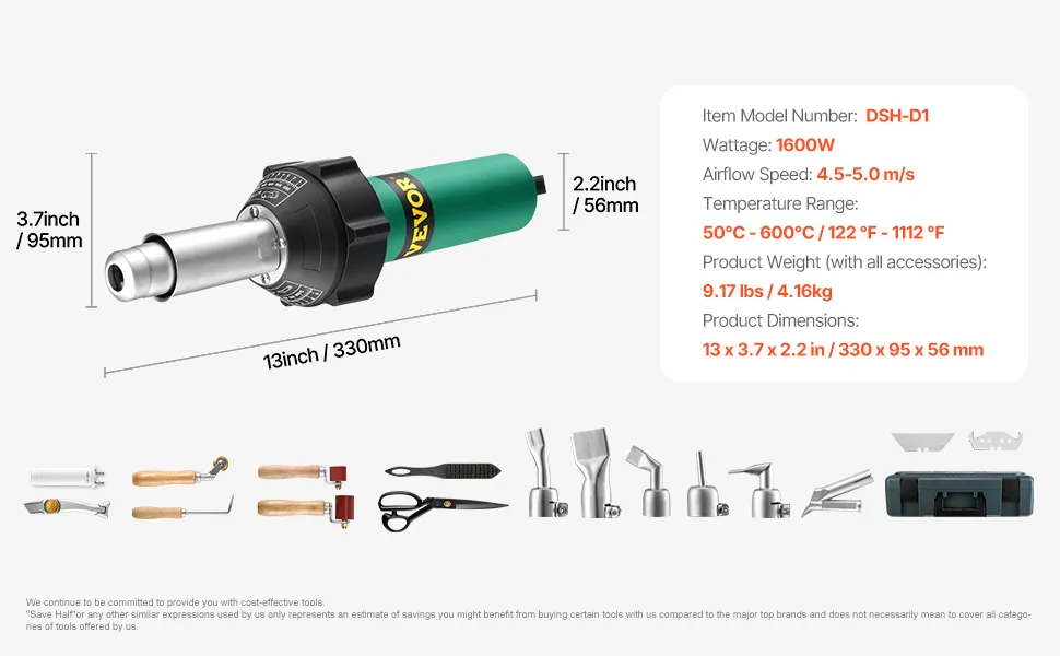 VEVOR Heißluft-Kunststoffschweißgerät, 1600 W Heißluftpistole, 50–600 °C PVC TPO Vinyl Schweißbrenner, Hot Air Welder Set mit 17 Zubehörteilen – Werkzeugkasten, Düse, Rolle, Klingen für PP/PE/PVC