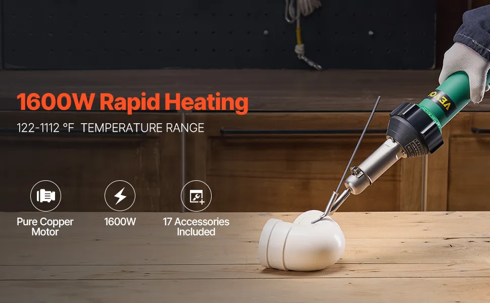 Das Heißluft-Kunststoffschweißgerät von VEVOR verfügt über einen leistungsstarken 1600-W-Motor aus reinem Kupfer, der für schnelles Aufheizen und effizientes Schweißen sorgt. Es enthält ein professionelles Kunststoffschweißset (mit 17 Zubehörteilen).