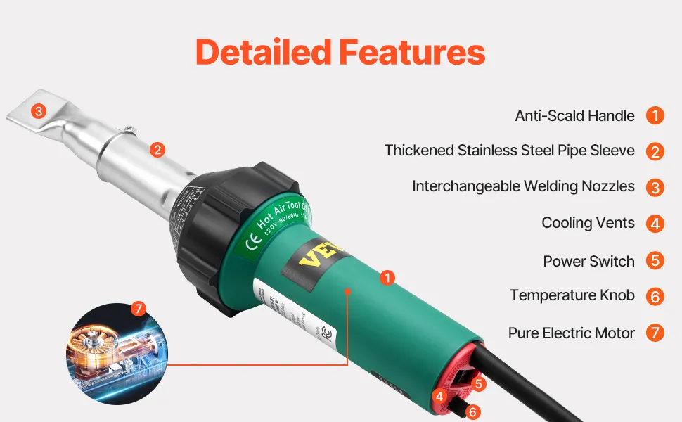 Die Heißluftpistole für Kunststoffschweißen von VEVOR verfügt über 6 Düsen – perfekt sowohl für präzises PVC-Rohrschweißen als auch für großflächige Arbeiten wie Planenreparaturen. Wechseln Sie einfach zwischen den Düsen, um jede anstehende Aufgabe zu bewältigen.