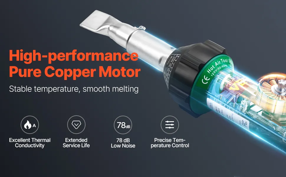 Das VEVOR-Schweißgerät verfügt über einen Hochleistungsmotor aus reinem Kupfer für stabile Temperaturen und hervorragende Wärmeleitfähigkeit. Durch die präzise Temperaturregelung läuft der Schmelzvorgang reibungsloser ab.