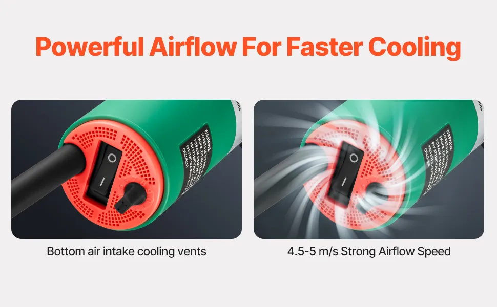 Ausgestattet mit einem leistungsstarken Luftstromsystem verbessert dieses Heißluft-Kunststoffschweißgerät die Luftzirkulation und beschleunigt die Wärmeableitung, wodurch eine stabile Leistung bei längerem Gebrauch gewährleistet wird.