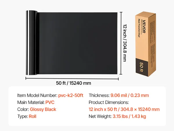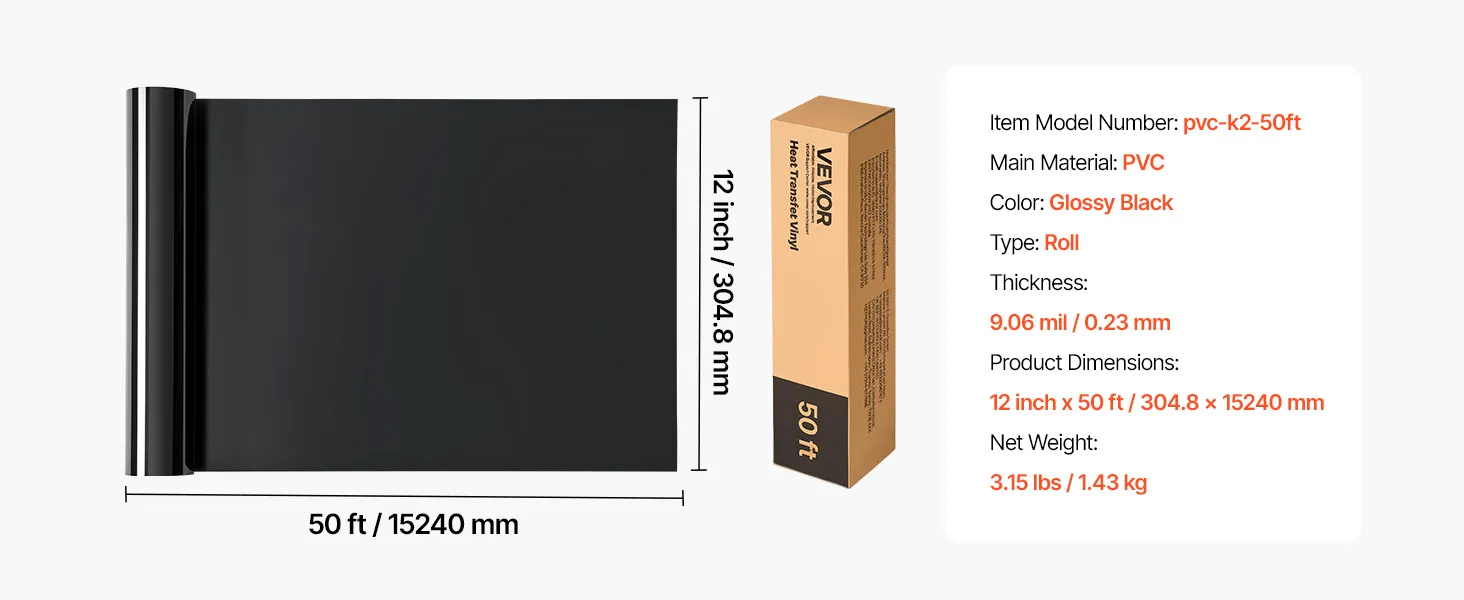 VEVOR Vinylfolie Wärmeübertragung Transferfolie (304,8 x 15240 mm), glänzend schwarze HTV-Bügelvinylrolle, kompatibel mit Schneidemaschinen, für verschiedene Materialien T-Shirts Kissen Hüte
