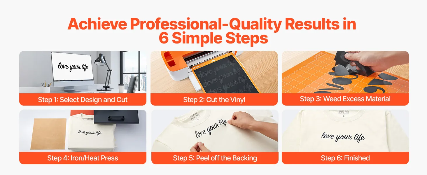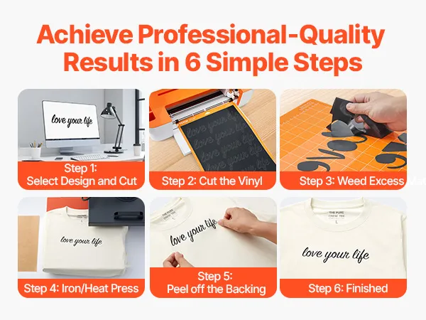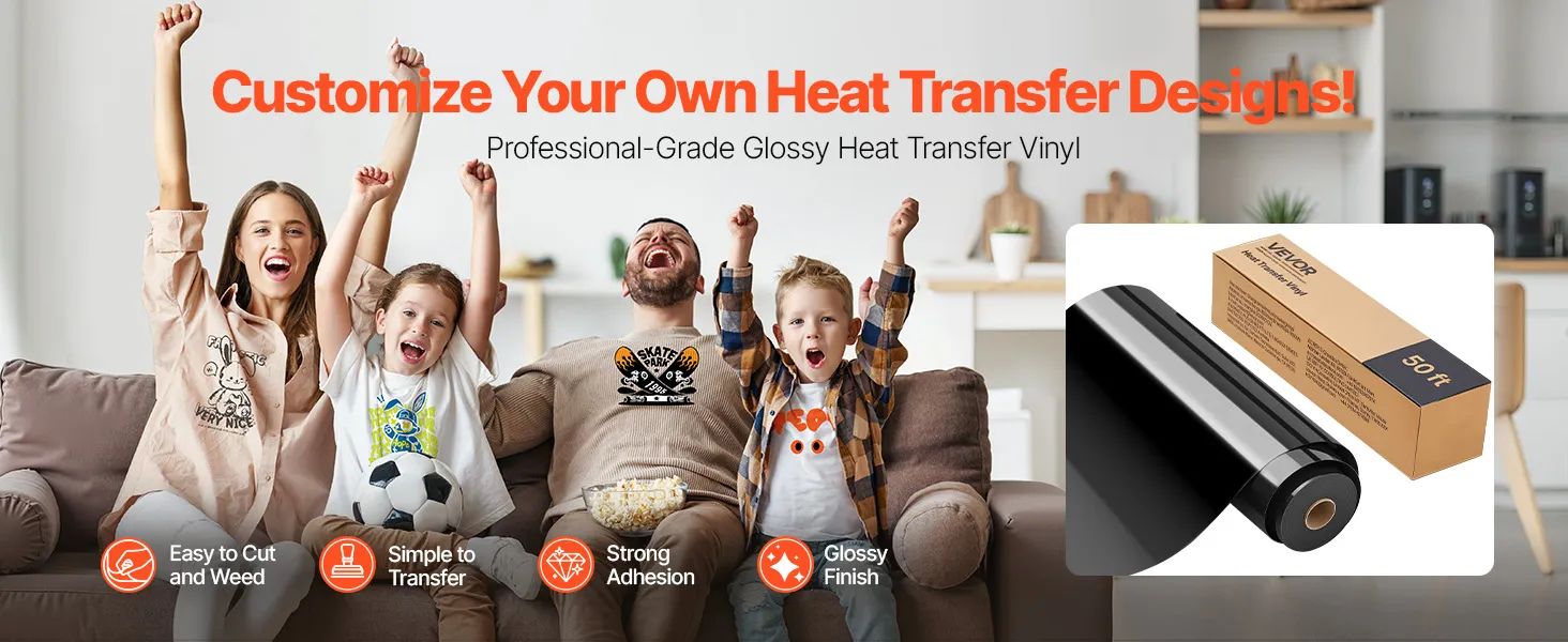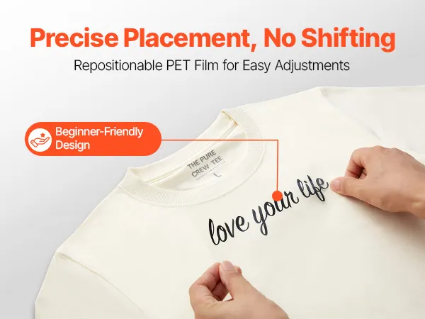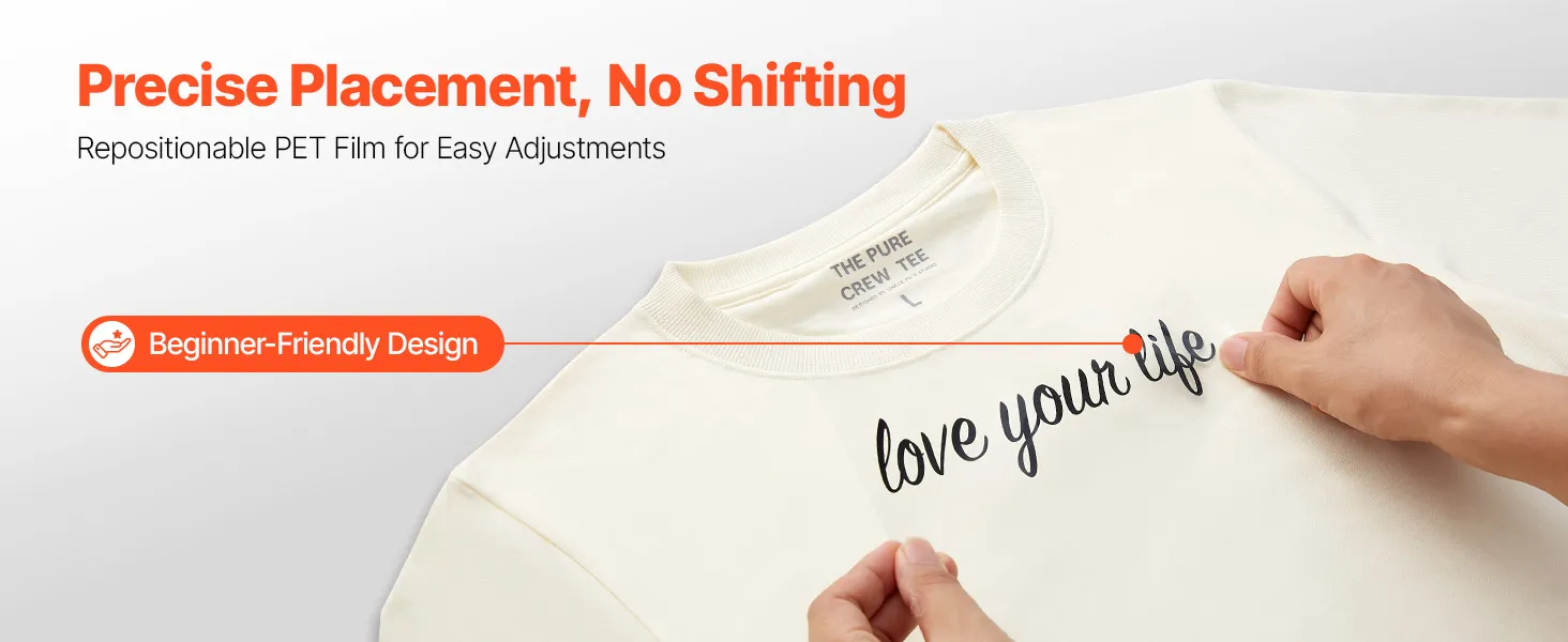 Die Vinylfolie verfügt über eine klebrige PET-Rückseite, die zur Positionierung an Kleidungsstücken haftet. Sie können vor dem Pressen manuell anpassen, um eine präzise Platzierung ohne Designverschiebung zu gewährleisten – kein Nachdenken erforderlich.