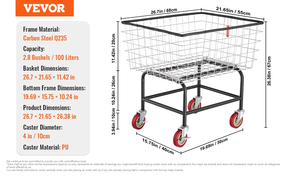 Dieses Gerät verfügt über eine beeindruckende Kapazität von 2,5 Bushel. Das bedeutet, dass Sie mehrere Ladungen Wäsche auf einmal hineinlegen können. Der Korb misst 27,25 x 22,25 x 11,5 Zoll, was die Anzahl der erforderlichen Gänge reduziert. Sie können mehr Wäsche in weniger Gängen transportieren. Darüber hinaus ermöglicht die Größe des Wagens die Aufnahme sperriger Gegenstände wie Tagesdecken, was ihn vielseitig und praktisch für eine Vielzahl von Wäschebedürfnissen macht. Darüber hinaus erleichtert sein geräumiger Korb das Sortieren und Ordnen Ihrer Wäsche. Er ist also perfekt sowohl für die Wäsche zu Hause als auch für gewerbliche Wäschekorbaufgaben geeignet.
