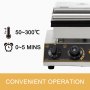 Glatte Knöpfe zur einfachen Steuerung des Waffels. Temperaturbereich: 50 - 300 ° C. LED-Anzeige für den Zustand der Heizung. Mit deutlicher und melodischer Fertigmeldung erkennen Sie, wann die Waffeln fertig gemacht werden.