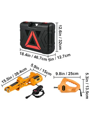 Elektrischer Scherenwagenheber und Schlagschrauber-Set, mit 2,5 T (5512 lbs) maximaler Hebekapazität, kann mit Strom aus dem Zigarettenanzünder oder der Autobatterie betrieben werden. Durch Betätigung des Hebeschalters kann der mechanische Teil des Wagenhebers stufenlos von 12 cm (4,7 Zoll) bis 35 cm (13,8 Zoll) verstellt werden, wodurch Autoreifen schnell angehoben werden können. In der Zwischenzeit kann der elektrische Schraubenschlüssel bequem die Befestigungsmutter verschiedener Räder und Fahrzeuge demontieren oder befestigen, indem er einfach den Startschalter drückt. Somit ist der Wagenheber ein ideales Werkzeug für Fahrzeugreparaturen und Reifenwechsel.