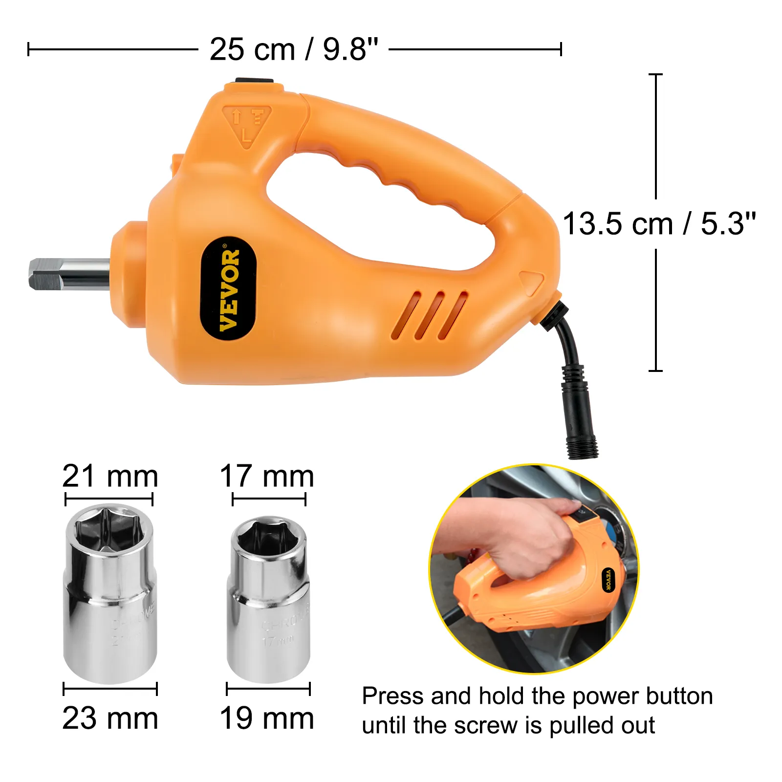 Der hochwertige Elektroschrauber ist mit einem tragbaren Griff, einem Ein-Knopf-Schalter, zwei doppelendigen Hülsen mit vier Spezifikationen, 17/19 mm, 21/23 mm (0,67/0,75 Zoll, 0,83/0,9 Zoll), ausgestattet, geeignet für die meisten Autos und Fahrzeuge.
