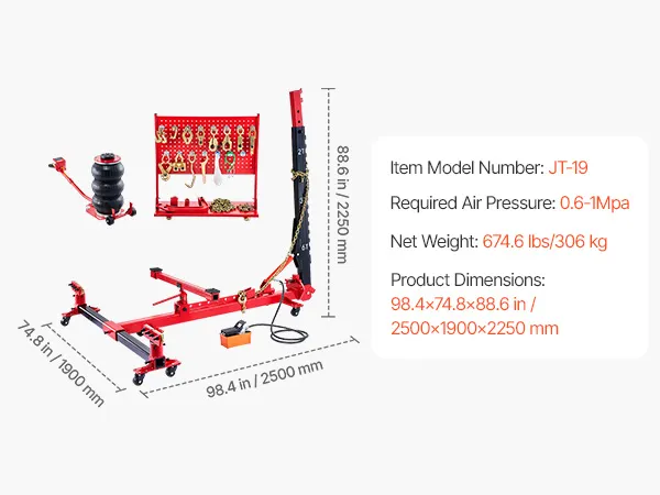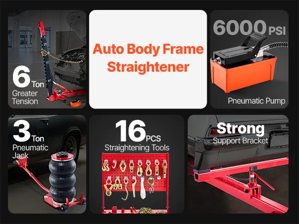 3 t Airbag-Wagenheber: Dieser Karosserierahmen-Abzieher verfügt über einen Hochleistungs-Airbag-Wagenheber mit einem Hubbereich von 5,7 bis 15,75 Zoll (145–400 mm). Er verfügt über ein verbessertes 6-stufiges Stahlrohr für sanftes Absenken und einen 3-lagigen verstärkten Airbag für zusätzliche Haltbarkeit