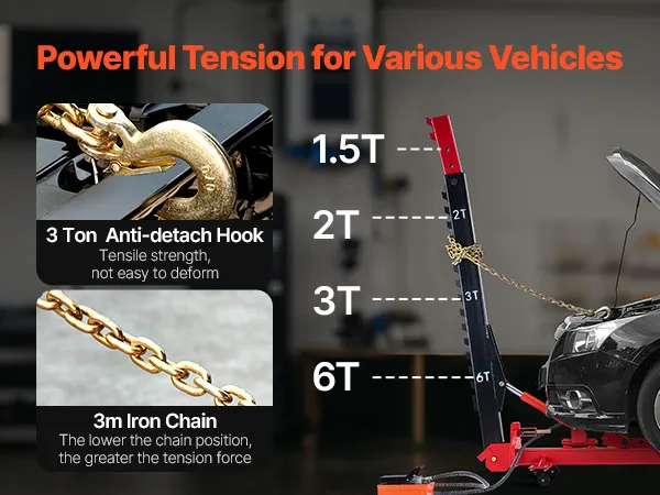 Dieser Karosserierahmen-Abzieher verfügt über eine 118 Zoll (3 m) lange, hochfeste Kette und einen 3-Tonnen-Haken mit Abreißsicherung. Die maximale Zugkraft beträgt bis zu 6 t, wobei die Zugkraft mit zunehmender Kettenrichtung zunimmt.