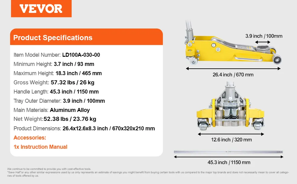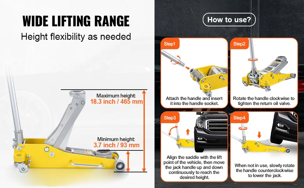 3 t Maximalgewicht: Unser Wagenheber hebt mühelos bis zu 3 t und eignet sich für Sportwagen, Familienlimousinen, leichte und mittelschwere Lkws und SUVs. Ob Sie ein professioneller Mechaniker oder ein Heimwerker sind, das Anheben von Fahrzeugen ist ein Kinderspiel.