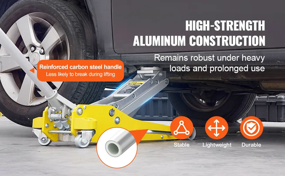 Robuste Aluminiumkonstruktion: Dieser kleine Wagenheber mit geschweißtem Rahmen bietet erhöhte Stabilität beim Einsatz. Die Aluminiumkonstruktion sorgt für Langlebigkeit auch bei Feuchtigkeit und widersteht Verformung und Korrosion. Durch sein geringes Gewicht ist er leicht zu tragen und zu bewegen - ideal für Arbeiten, die häufiges Umsetzen erfordern. Der Griff aus unlegiertem Stahl ist verstärkt und verdickt, damit er beim Anheben nicht bricht.