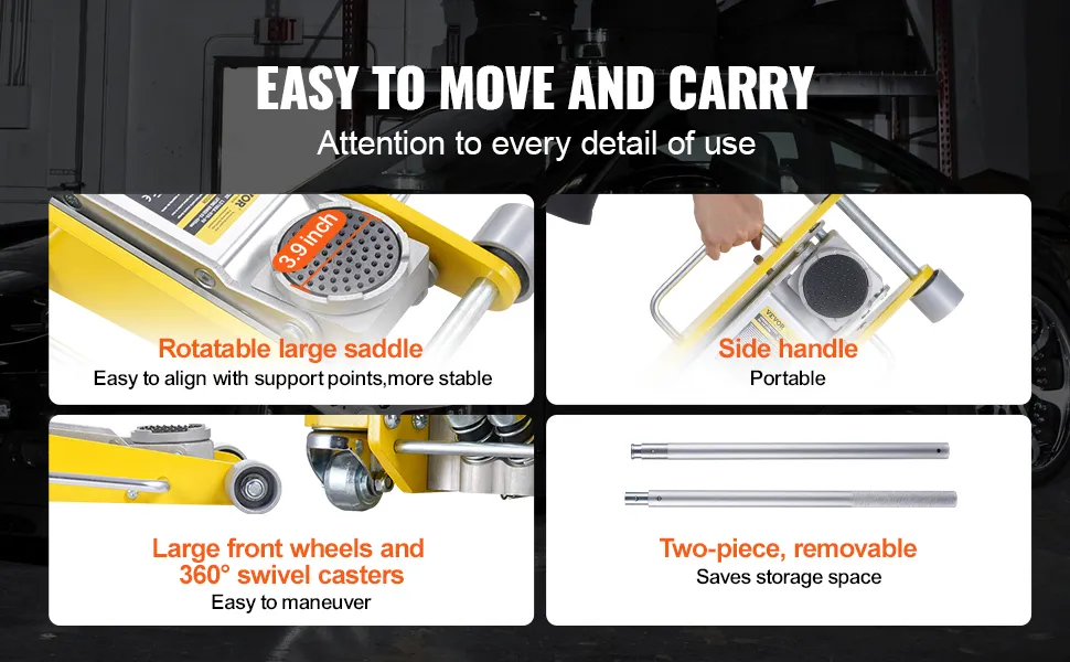 Ausgestattet mit einem großen Sattel zum Schutz des Fahrzeugs, doppelten seitlichen Handgriffen, großen Vorderrädern und Lenkrollen zum schnellen und einfachen Bewegen und Transportieren des Wagenhebers; der Handgriff ist abnehmbar.
