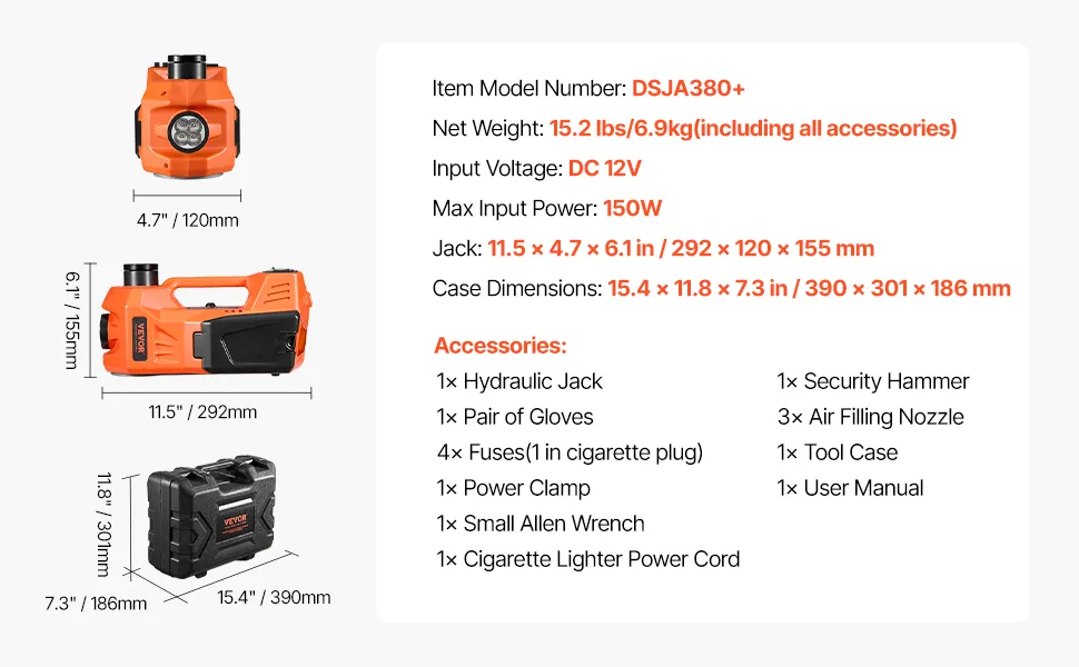 Wenn Ihr Auto unterwegs eine Reifenpanne hat, bietet unser elektrischer Wagenheber-Satz unübertroffene Unterstützung. Der Wagenheber ist mit einem Aufpumpgerät ausgestattet und verwendet eine hochwertige Hydraulikstruktur und einen leistungsstarken Motor, um das Fahrzeug in 2 Minuten anzuheben und die Reifenschrauben in Sekunden zu entfernen.