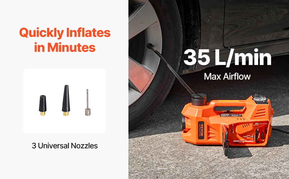 Aufpump- und Hebekombination: Unser elektrischer Wagenheber kombiniert Aufpump- und Hebefunktionen und verfügt über 3 Standarddüsen, mit denen sich der Reifen in wenigen Minuten aufpumpen lässt. Der hydraulische Wagenheber verbessert die Effizienz beim Reifenwechsel.