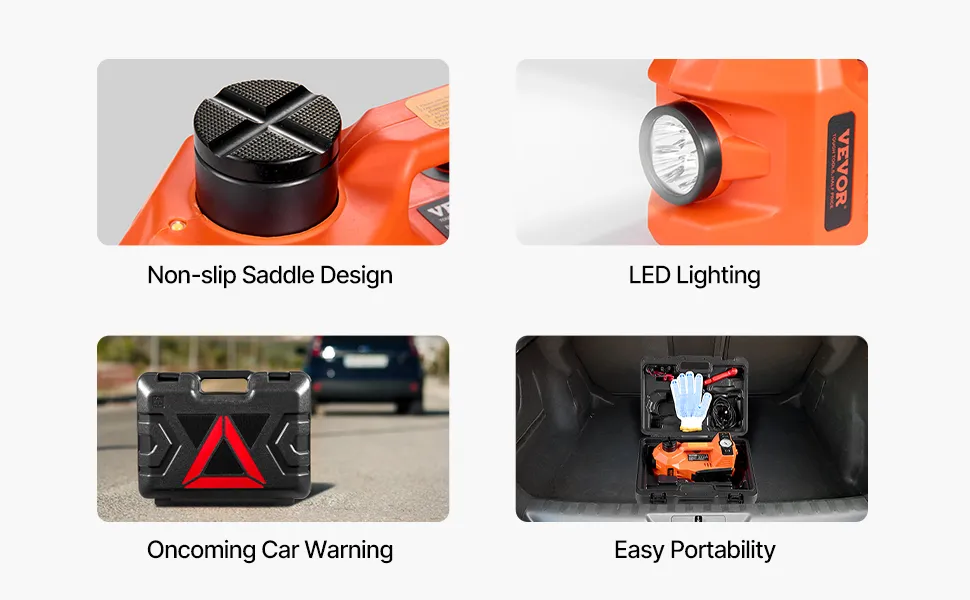 Unser elektrischer Wagenheber verfügt über ein rutschfestes Querrillendesign am Kopf, um ein Abrutschen zu verhindern. Er wird außerdem mit einem sicheren Warnwerkzeugkasten und einem LED-Licht geliefert, um unerwartete Situationen zu bewältigen. Probieren Sie unseren benutzerfreundlichen elektrischen Wagenheber aus!