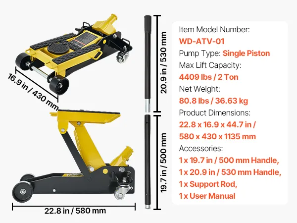 Der Wagenheber arbeitet leichtgängig und bietet einen weiten Hubbereich. Dank der flachen Bauweise lässt er sich mühelos unter Fahrzeuge schieben und hebt sie auf eine komfortable Höhe für Reparatur- und Wartungsarbeiten.
