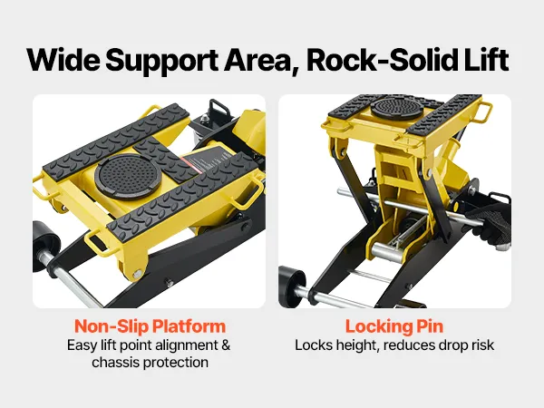 Große & rutschfeste Plattform: Der flache Wagenheber ist mit einer extra großen Plattform (305 x 235 mm / 12 x 9,3 Zoll) ausgestattet. Die strukturierte Oberfläche verbessert den Halt und erleichtert das Ausrichten an den Hebepunkten. Sie stützt Chassis und Motorradmotoren und schützt gleichzeitig den Unterboden