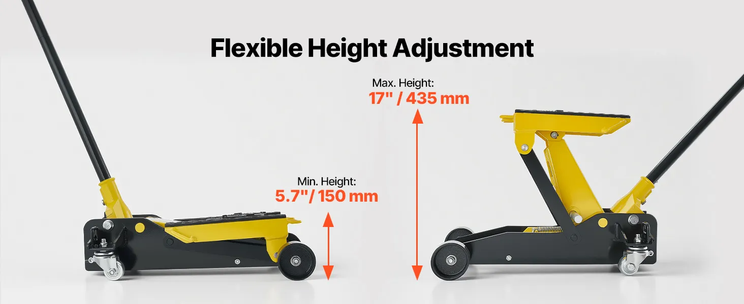 Erweiterter Hubbereich: Der Wagenheber hebt Fahrzeuge von 150 bis 435 mm (5,7–17 Zoll) an. Dank der flachen Bauweise lässt er sich problemlos unter Pkw schieben und bietet zugleich ausreichend Hubhöhe. Zum Anheben das Ablassventil festziehen und pumpen, zum Absenken den Griff gegen den Uhrzeigersinn drehen