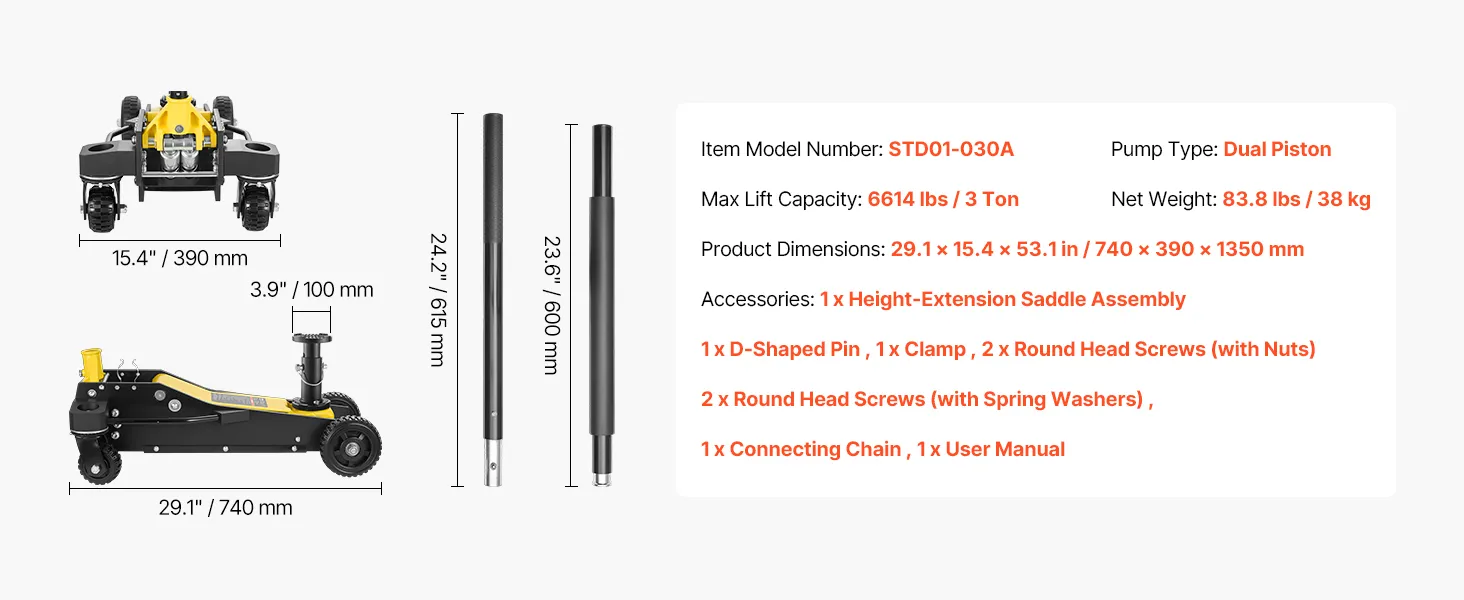 Unser Wagenheber mit erweiterter Hubhöhe verfügt über eine zusätzliche Verlängerungssäule zum Anheben von Fahrzeugen mit hoher Bodenfreiheit. Die zusätzliche Höhe erleichtert und vereinfacht Reparatur- und Wartungsarbeiten.
