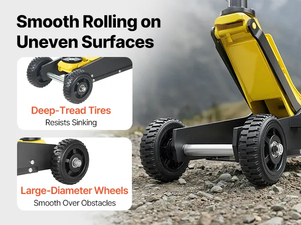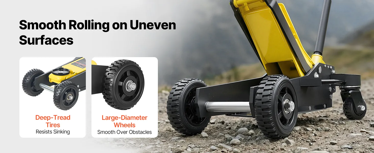 Dieser hydraulische Rangierwagenheber ist mit großen Rollen für leichtes Manövrieren ausgestattet. Er rollt mühelos auf Steinwegen oder Schotterstraßen im Freien. Das Positionieren unter dem Fahrzeug erfordert nur einen geringen Kraftaufwand.