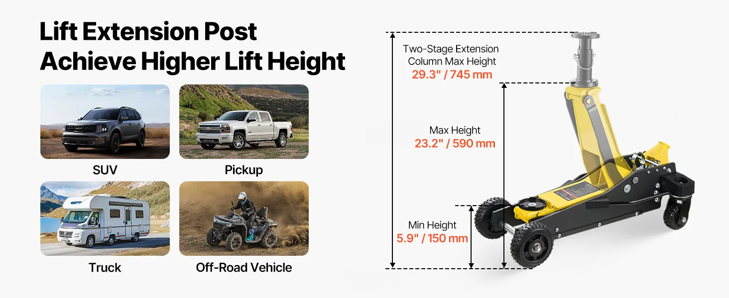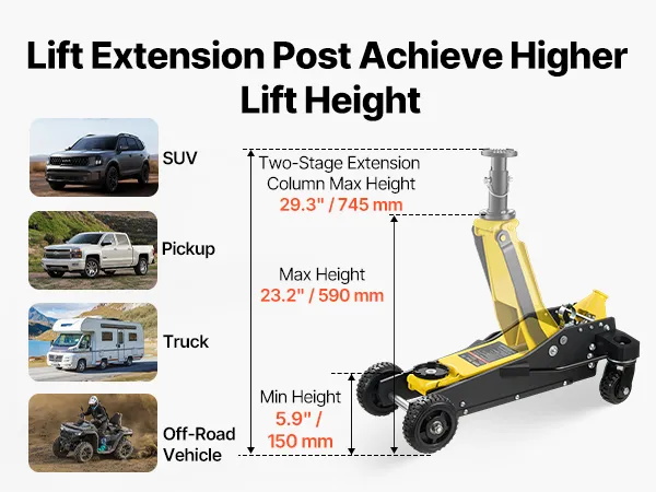 Hubverlängerung: Dieser Wagenheber ist für das Anheben von Geländewagen konzipiert. Er hebt Fahrzeuge von 150 bis 590 mm (5,9–23,2 Zoll) an. Mit der montierten Hubverlängerung erreicht er eine maximale Hubhöhe von 745 mm (29,3 Zoll). Damit eignet er sich auch für Geländewagen und andere Fahrzeuge mit großer Bodenfreiheit