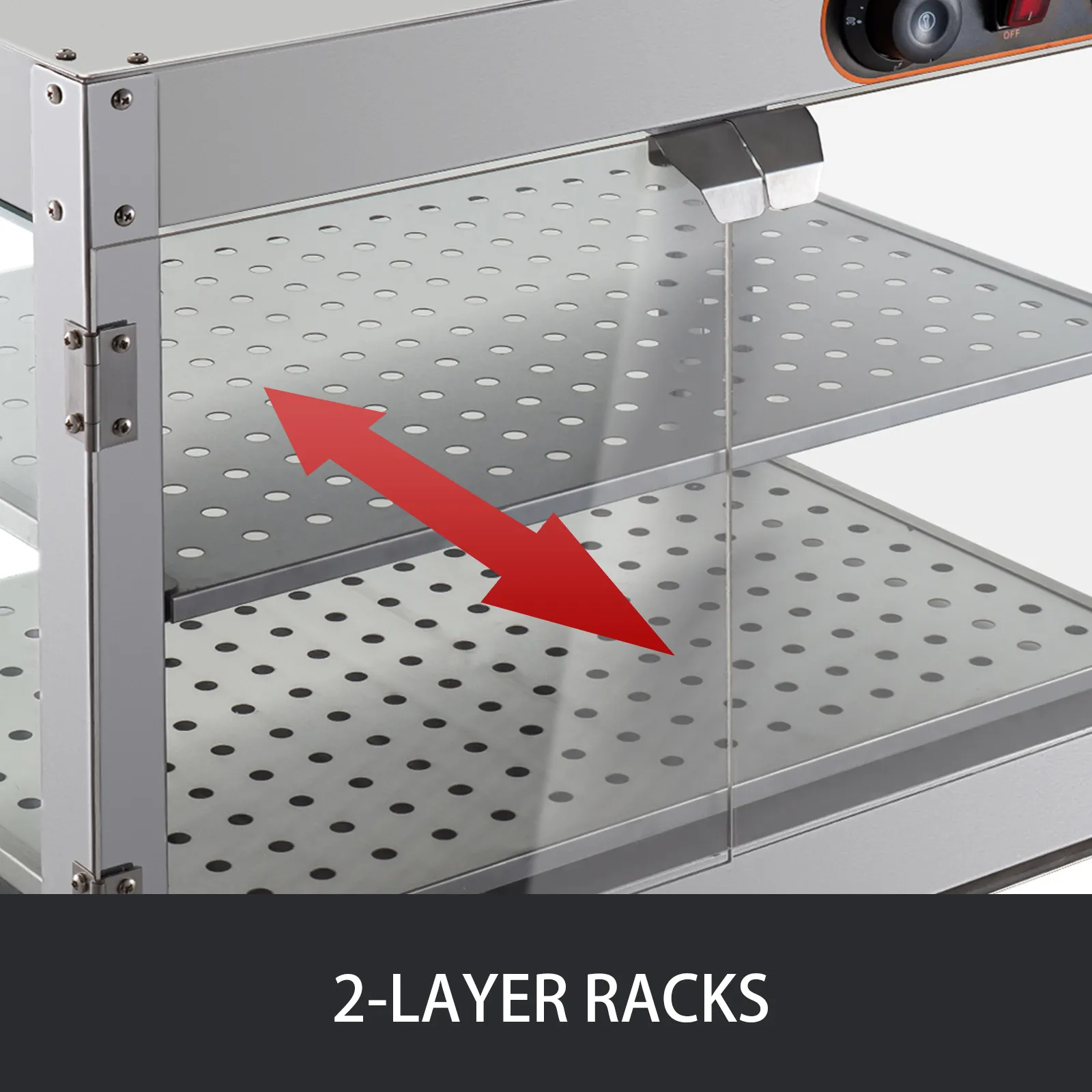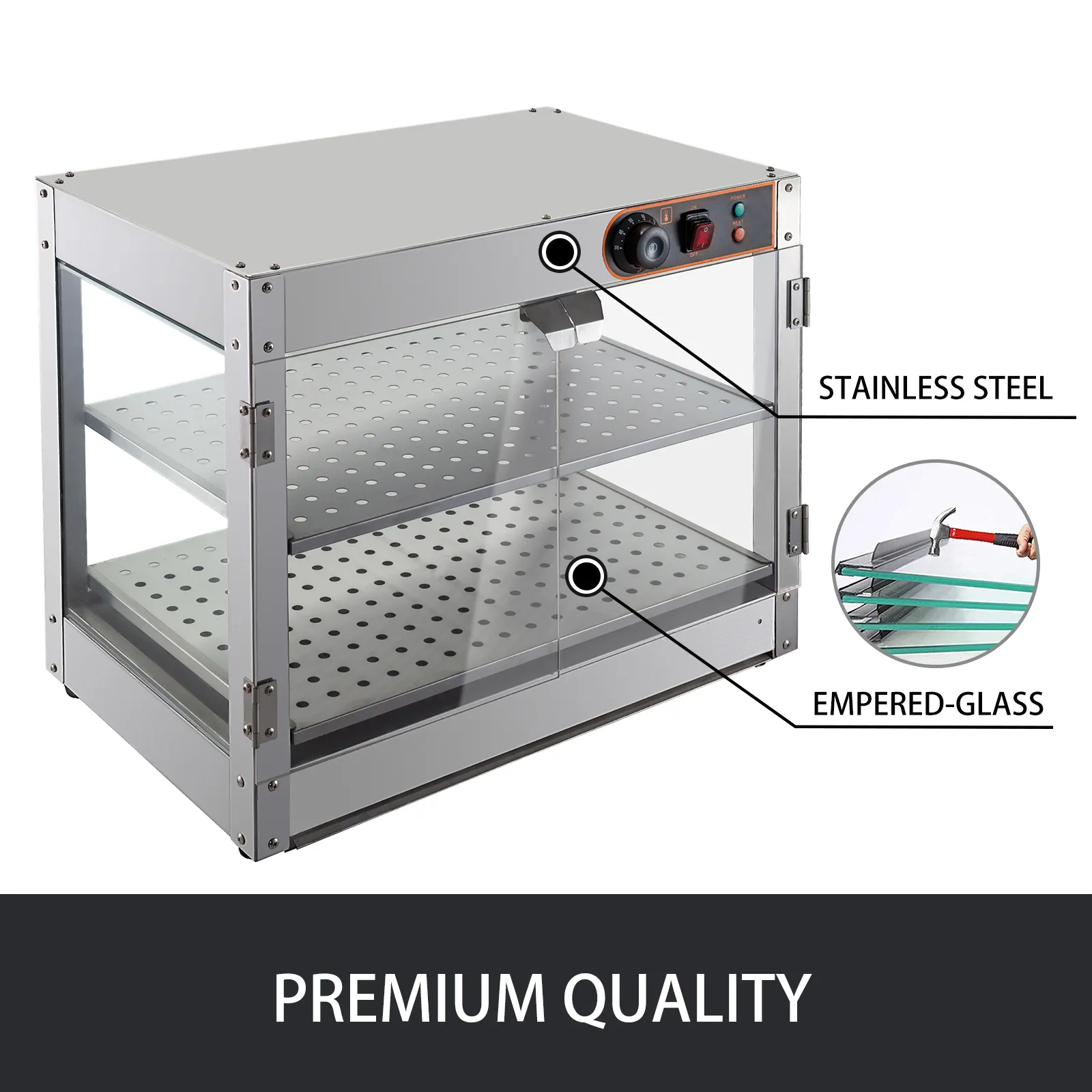 Dieser Speisenwarmhalten ist mit einem robusten Edelstahlrahmen, gehärteten Glaswänden und Acryl-Türen ausgestattet. Mit starker Stabilität und verbesserter Sichtbarkeit.