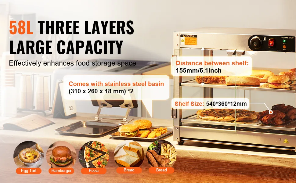 2-stöckiger & großer Raum: Abmessungen: 24 x 14,96 x 20,08 Zoll (610 x 380 x 510 mm). Unser Speisenwärmer für die Arbeitsplatte verfügt über zwei geräumige, lebensmittelechte Ablagen, auf denen Sie Speisen unterschiedlicher Größe frei platzieren können. Ideal zur Aufbewahrung und Präsentation von Pizza, Pfannkuchen, Hähnchen oder Hamburgern.