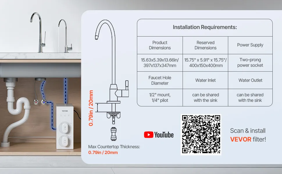 2:1 Reinwasser zum Abfluss: Unser Umkehrosmosesystem unter der Spüle optimiert den Wasserverbrauch im Haushalt mit einer Kapazität von 400 GPD und einem Verhältnis von Reinwasser zu Abwasser von 2:1 und spart so 800 % mehr Wasser. Der zuverlässige Wasserhahn aus Edelstahl 304 passt in Löcher mit den Abmessungen 1/4 Zoll innen und 11/4 Zoll außen