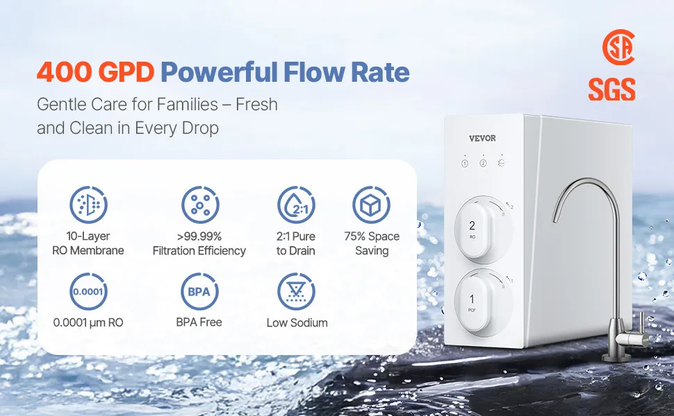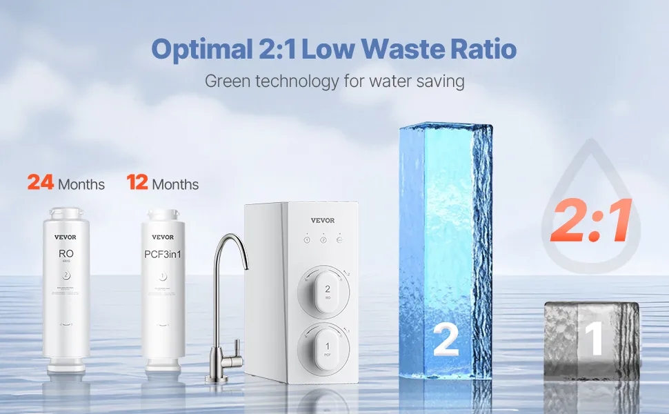 Mit einem Reinwasser-Abfall-Verhältnis von 2:1 maximiert dieses tanklose Umkehrosmosesystem Ihre Wassereffizienz. Darüber hinaus unterstützt seine großzügige Kapazität von 400 GPD und die Durchflussrate von 1 L/min alle Ihre Anforderungen, wie Obstwaschen, Kochen und Gerätenutzung.