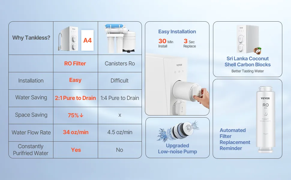Verpassen Sie nie wieder einen Filterwechsel mit der intelligenten Erinnerung unseres tanklosen Umkehrosmose-Systems unter der Spüle. Dank des ausziehbaren Designs ist der Filterwechsel in nur 3 Sekunden erledigt. Die geräuscharme Pumpe hält Ihr Wasser frisch, ohne Ihren Haushalt zu stören.