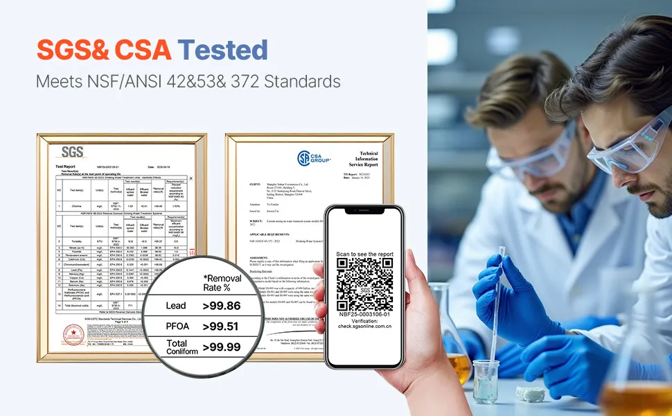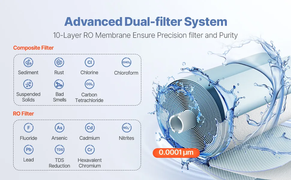 Ausgestattet mit RO- und PCF-Verbundfiltern bietet unser tankloses Umkehrosmosesystem eine 8-stufige Tiefenfiltration, die Verunreinigungen und unangenehme Gerüche wirksam reduziert und gleichzeitig den Geschmack bei jedem Schluck verbessert.