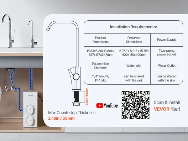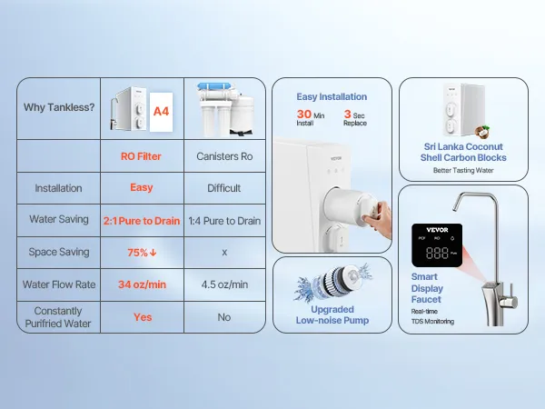 2:1 Reinwasser zum Abfluss: Unser Umkehrosmosesystem unter der Spüle optimiert den Wasserverbrauch im Haushalt mit einer Kapazität von 600 GPD und einem Verhältnis von Reinwasser zu Abwasser von 2:1 und spart so 800 % mehr Wasser. Der intelligente Wasserhahn mit Echtzeit-TDS-Anzeige passt in Löcher mit den Größen 1/4 Zoll innen und 11/4 Zoll außen