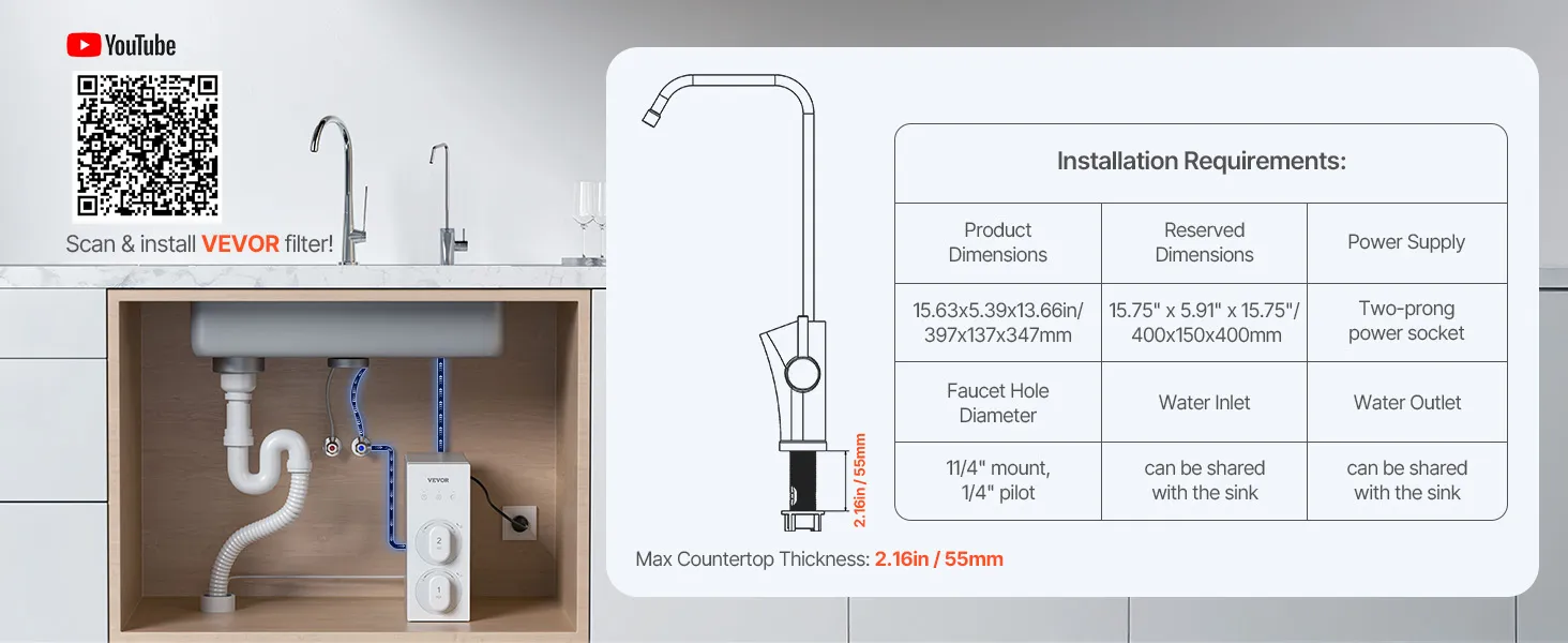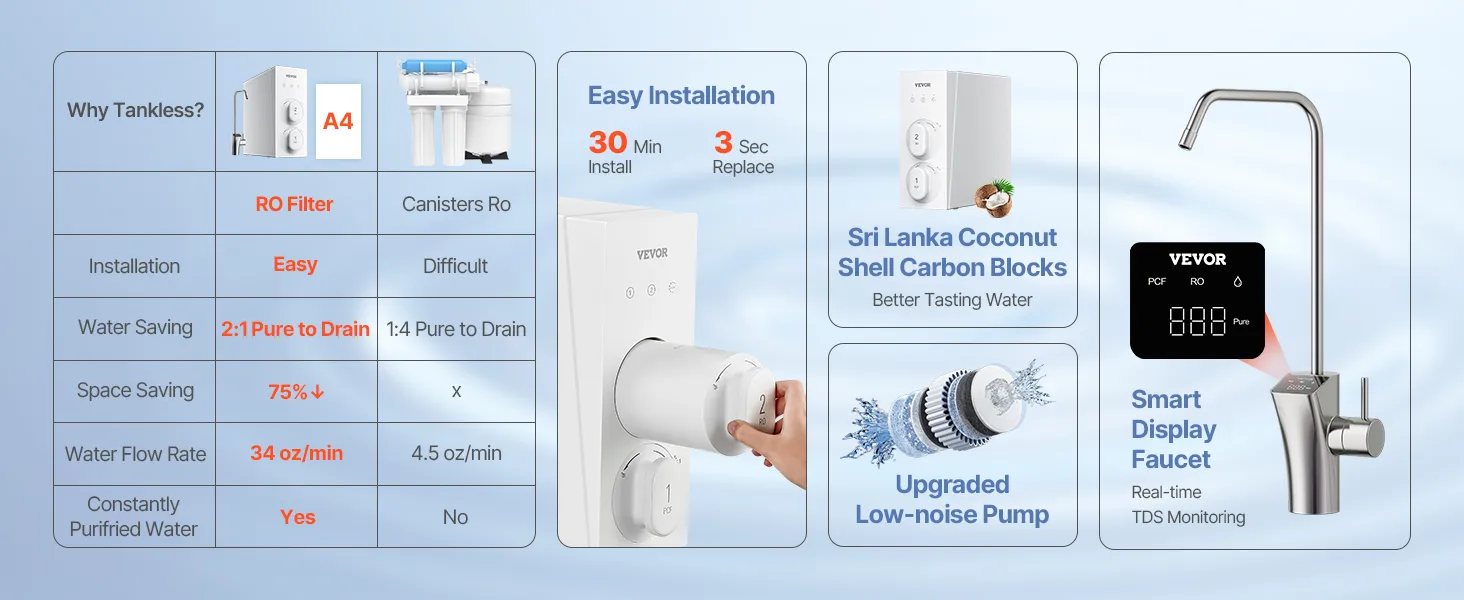 Kompaktes Tankless-System: Mit kompakten Abmessungen von 397 x 137 x 347 mm (15,63 x 5,39 x 13,66 Zoll) spart unser Tankless-Umkehrosmosesystem 75 % Platz unter der Spüle und verhindert Wasserverunreinigungen. Mit einem nahtlosen Design zur Reduzierung von Leckagen und einer schnellen 30-minütigen Installation ist es die leise, effiziente Lösung für Ihre Küche zu Hause oder im Restaurant