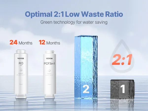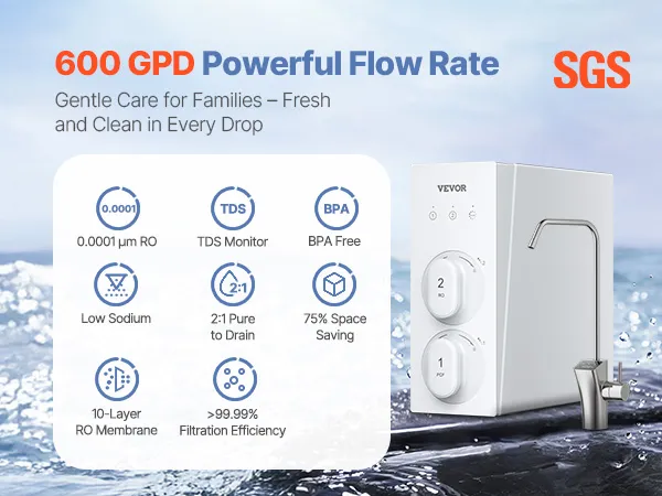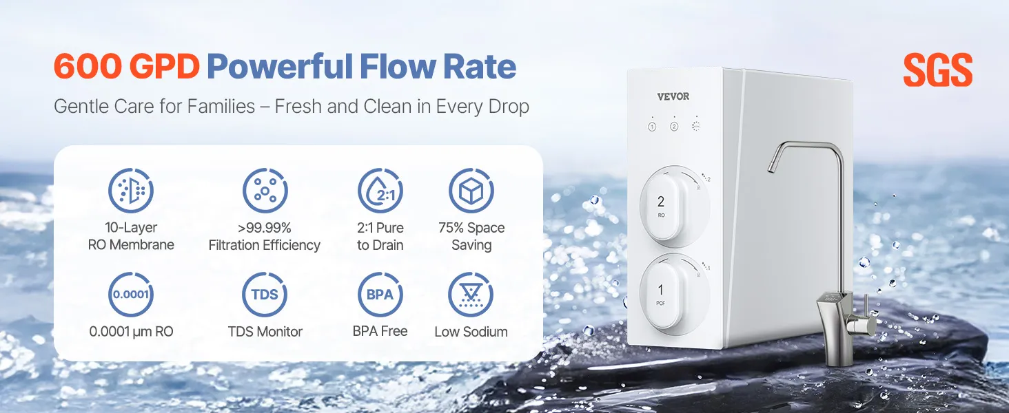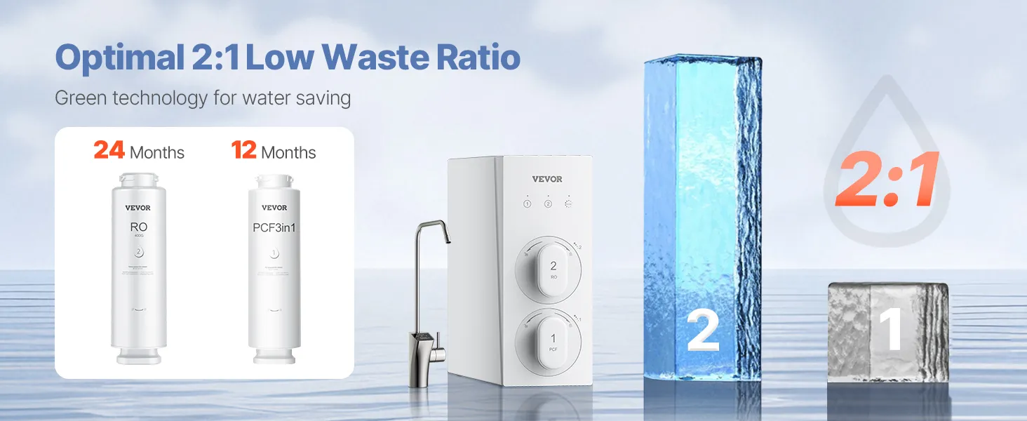 Mit einem Reinwasser-Abfall-Verhältnis von 2:1 maximiert dieses tanklose Umkehrosmosesystem Ihre Wassereffizienz. Darüber hinaus erfüllt seine großzügige Kapazität von 600 GPD und die Durchflussrate von 1,5 L/min alle Ihre Anforderungen, wie Obstwaschen, Kochen und Gerätenutzung.