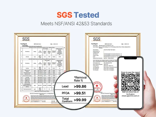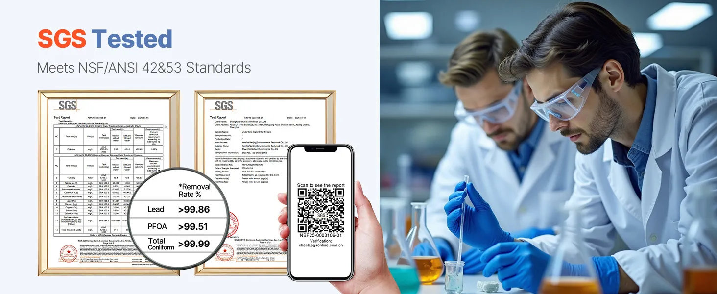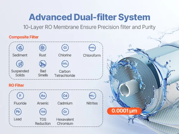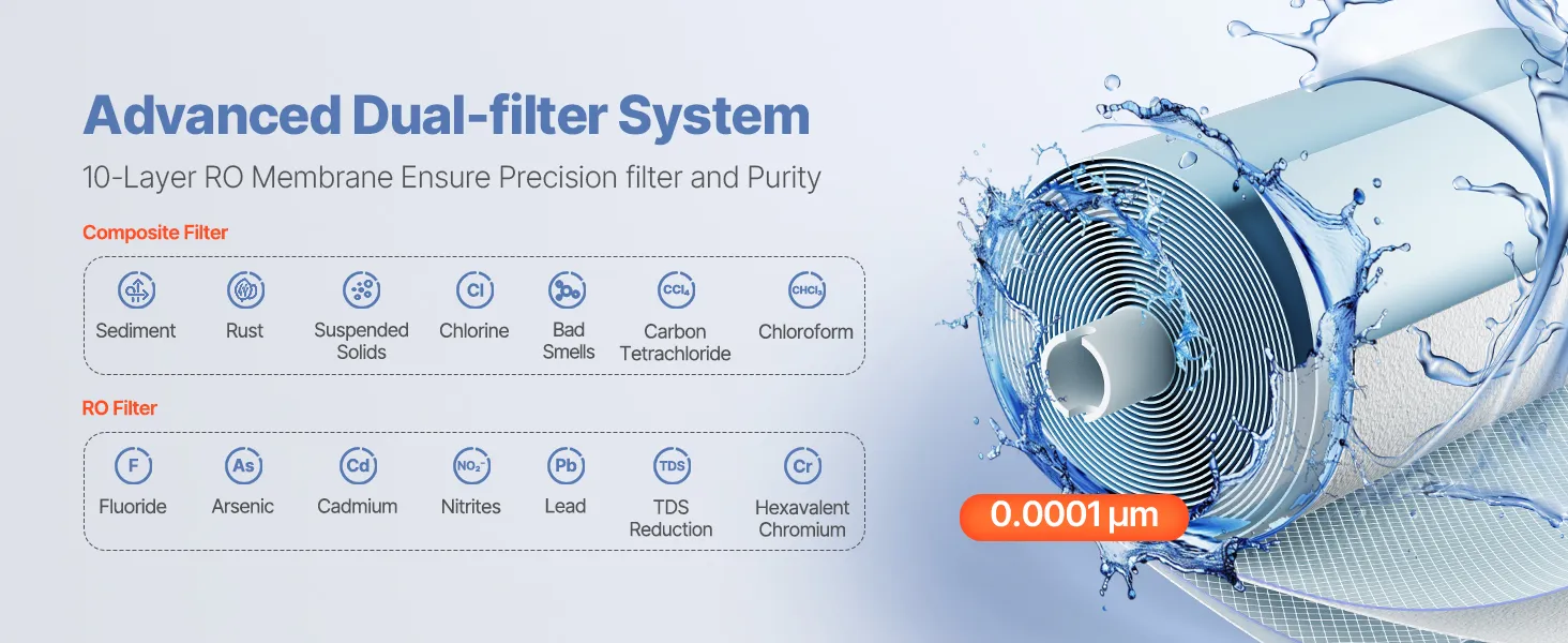 Ausgestattet mit RO- und PCF-Verbundfiltern bietet unser tankloses Umkehrosmosesystem eine 8-stufige Tiefenfiltration, die Verunreinigungen und unangenehme Gerüche wirksam reduziert und gleichzeitig den Geschmack bei jedem Schluck verbessert.